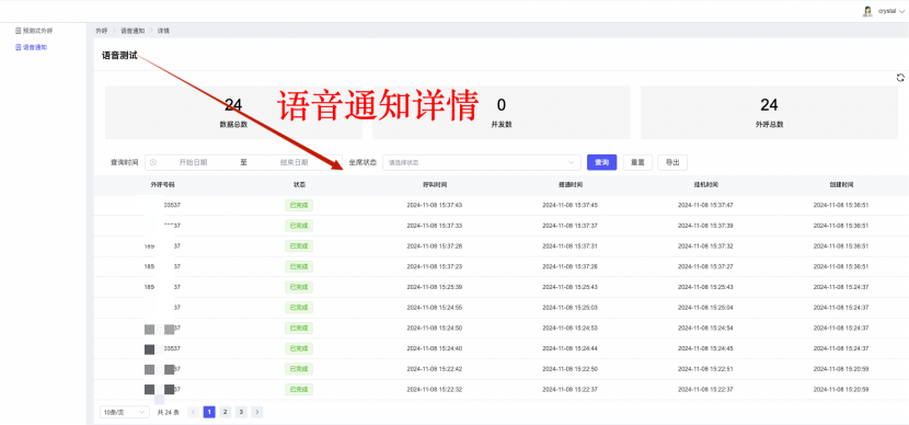 ## 1、预测试外呼 支持创建预测试外呼的时间,中继号并发数等,如图  ### 1)查询区 (1)关键词:输入关键词进行查询搜索 (2)状态:下拉选择预测试外呼的状态,待开始/运行中/已暂停进行搜索数据,搜索的数据在列表中显示 ### 2)列表区 (1)ID:系统生成的序号ID (2)任务编号:系统生成的任务编号 (3)状态:外呼任务的状态,当前是待开始还是已暂停的状态,当“待开始”,“已暂停”的时候,可以进行外呼状态的启用,如图;  (4)数据总数:显示外呼名单的总数据,点击导入则可上传数据,如图  a、任务编号ID:显示系统生成任务的ID编号 b、任务名称:显示任务的名称 c、外呼名单:如果没有外呼名单的模板,则点击下载模板,填充数据,进行上传,如果有模板或数据直接填充好数据点击上传名单。 d、去重规则:选择是否去重和去重方式,单选,默认不去重 注意:不去重:导入的外呼名单数据不去重;名单去重:导入的该名单数据去重;当前任务去重:针对当前的名单任务去重;全部任务去重:针对所有任务的名单去重 (5)比列:显示预测试外呼的比例,点击编辑可以进行修改,默认输入1 (6)已呼叫:已呼叫的数量 (7)已接通:呼叫出去已接通的数量 (8)坐席已接通:预测试外呼出去已接通转给坐席接通的数量 (9)创建时间:创建预测试外呼任务的时间,具体到年月日,时分秒 (10)操作:详情/编辑/删除 ### 3)操作 (1)新建:点击新建,创建外呼任务,如图  任务名称:必填,输入任务名称,最多输入50个字符 队列:必填,下拉选择预测试外呼结束转的队列 比列:必填,输入预测试外呼的比列,默认是1, 时间范围:必填,输入预测试外呼的时间范围,开始时间到结束时间,筛选范围时分秒 中继号:必填,选择外呼出去的中继号码,以及外呼的并发数 星期: (2)详情:点击详情,查看预测试外呼的详情,如图  a、总览 数据总数:该预测试外呼任务的名单总数据 并发数:任务的并发数 已呼叫:该数据名单中已经呼叫的电话数 未呼叫:该名单中未呼叫的电话数 已接通:已呼叫的名单中接通的电话数 未接通:已呼叫的名单中没有接通的电话数 坐席已接通:已接通的电话转接给坐席接通的数量 坐席未接通:已接通的电话转接给坐席没有接通的数量 b、查询区 查询时间:输入时间段进行查询,开始时间至结束时间 坐席状态:下拉选择坐席的状态来进行查询,枚举值有,客户未接通数、坐席接通数、客户接通坐席未接通数 C、列表区 外呼号码:外呼名单的电话号码 状态:该数据外呼的状态,是待开始还是已完成 呼叫时间:外呼电话的时间,具体到年月日,时分秒 接通时间:外呼电话出去,接通的时间,具体到年月日,时分秒 挂机时间:电话挂机的时间,具体到年月日,时分秒 创建时间:创建该数据的时间,具体到年月日,时分秒 转坐席名称:转接的坐席成员 D、导出 点击“导出”,导出列表的数据 (3)编辑:点击编辑,编辑任务信息,如图  (4)删除,点击删除,删除该任务信息,如图  ## 2、语音通知 外呼出去进行语音通知,通过导入名单,上传语音语音文件进行外呼播报的场景,如图  ### 1)查询区 (1)关键词:输入关键词进行查询搜索 (2)状态:下拉选择语音通知的状态,待开始/运行中/已暂停进行搜索数据,搜索的数据在列表中显示 ### 2)列表区 (1)ID:系统生成的序号ID (2)任务编号:系统生成的任务编号 (3)状态:语音通知的状态,当前是待开始还是已暂停的状态,当“待开始”,“已暂停”的时候,可以进行语音通知状态的启用,如图;  (4)数据总数:显示外呼名单的总数据,点击导入则可上传数据,如图  a、任务编号ID:显示系统生成任务的ID编号 b、任务名称:显示任务的名称 c、外呼名单:如果没有外呼名单的模板,则点击下载模板,填充数据,进行上传,如果有模板或数据直接填充好数据点击上传名单。 d、去重规则:选择是否去重和去重方式,单选,默认不去重 注意:不去重:导入的外呼名单数据不去重;名单去重:导入的该名单数据去重;当前任务去重:针对当前的名单任务去重;全部任务去重:针对所有任务的名单去重 (5)外呼数:已呼叫的数量 (6)接通数:呼叫出去已接通的数量 (7)创建时间:创建预测试外呼任务的时间,具体到年月日,时分秒 (8)操作:详情/编辑/删除 ### 3)操作 (2)(1)新建,点击“新建”创建新的语音通知,如图  (2) 详情:点击“详情”查看语音通知的名单,如图  a、总览 数据总数:该预测试外呼任务的名单总数据 并发数:任务的并发数 外呼总数:该数据名单中已经呼叫的电话数 b、查询区 查询时间:输入时间段进行查询,开始时间至结束时间 坐席状态:下拉选择坐席的状态来进行查询,枚举值有,客户未接通数、客户接通数 C、列表区 外呼号码:外呼名单的电话号码 状态:该数据外呼的状态,是待开始还是已完成 呼叫时间:外呼电话的时间,具体到年月日,时分秒 接通时间:外呼电话出去,接通的时间,具体到年月日,时分秒 挂机时间:电话挂机的时间,具体到年月日,时分秒 创建时间:创建该数据的时间,具体到年月日,时分秒 D、导出 点击“导出”,导出列表的数据 (3) 编辑:点击“编辑”编辑该语音通知的信息,如图  (4) 删除:点击“删除”删除该语音通知的信息,如图