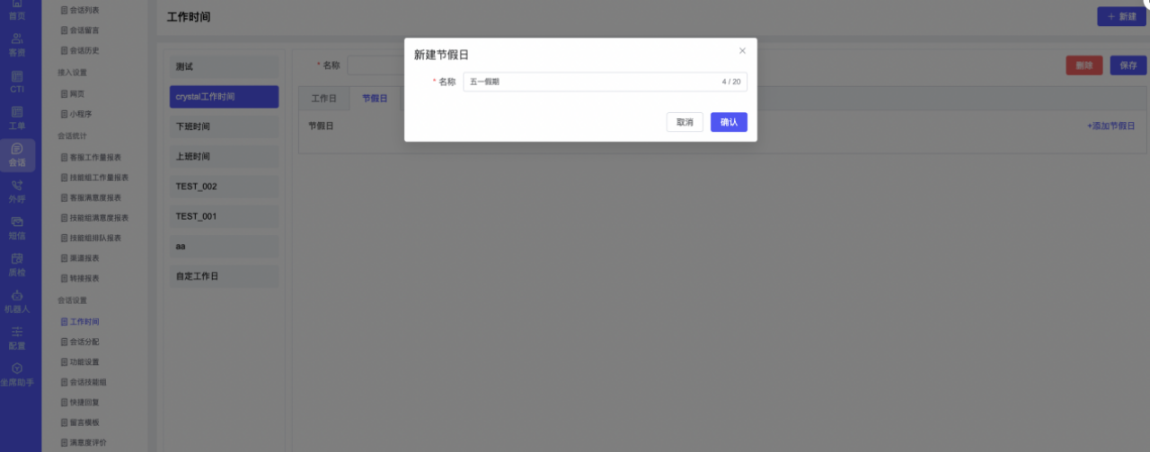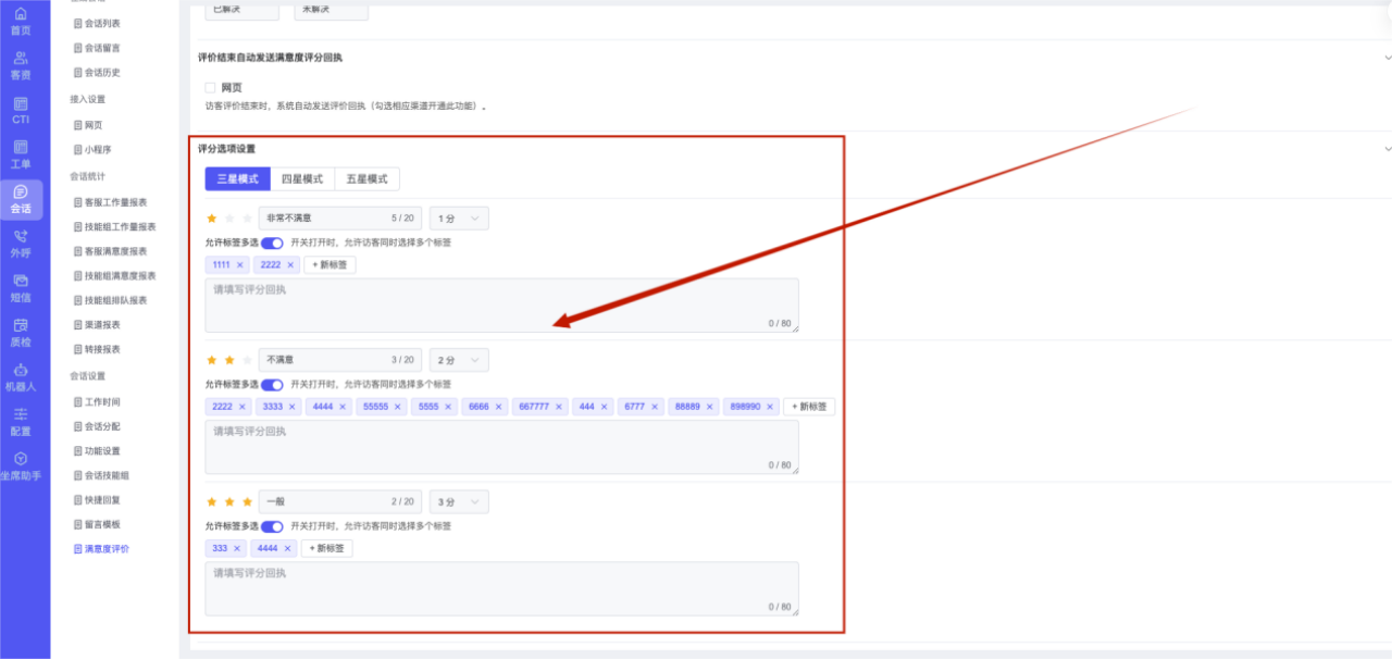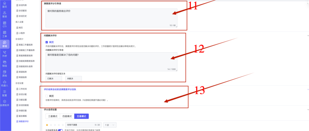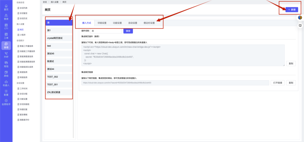 ## 1、在线会话 ### 1.1 会话列表 访客进线之后坐席端和访客端聊天页面 #### 1)坐席端页面展示 1)当前会话:展示访客进线人数和当前在聊天的客户。  2)排队中:目前等待排队进线的人数,排队中点击“接入”接起会话,如图。  3)会话标签:可以对该会话打上对应的标签,可自定义标签,如图。  4)转接:点击转接可以转给其他坐席(需要对方确认接入,方可转接成功)如图。  5)结束会话:点击结束会话,可以结束当前会话;如图  坐席退出当前聊天页面,可点击邀请评价;如图  访客端展示评价信息,访客可对本次服务做出点评,打分值;如图  6)在线:点击在线可以切换坐席当前状态(在线/忙碌/隐身/离开/离线)。  设置:点击设置,弹出会话设置,设置最大接待人数(最大只能接待99人)超过设定人数进入排队列表中。选择是否发送个人问候语,如果开启则输入问候语,如:“我是客户小明,我的工号是1008,很高兴为你服务”  7)常用语:(1).点击常用语展示当前坐席的个人快捷回复内容  (2).点击公共展示公共快捷回复内容。  8)访客信息:查看客户当前信息,如图。  9)资料:点击资料可以对当前客户进行填写资料数据,如图。  10)工具栏:点击输入框上方的附件按钮,,可以选择对应的表情包,图片,文件发送。  清空:点击清空可以清空输入框内没有发送出去的所有内容。  #### 2)访客端页面展示 1)页面展示 企业LOGO和企业名称/广告栏消息可以在接入设置—网页里面添加更改。  2)侧边栏展示的所有信息只能用于查看,在接入设置—网页侧边栏设置里面添加更改。  3)快捷按钮,(转人工/评价留言)在接入设置—网页里面添加配置。  4)工具栏:(表情/图片/附件/评价/留言)访客端可以主动点击发送。  ### 1.2 会话留言 留言页面展示:  1.全部数据:点击全部数据(包括全部/未处理/处理中/已处理/未分配留言)可以查看到当前部门所有的留言数据 2.我的数据:点击我的数据可以查看到我的留言数据 3.编辑:点击编辑按钮可以对本次留言数据继续处理(分配处理人/更改当前状态),其中“分配给我”快捷指定坐席本人  ### 1.3 会话历史 会话结束后生成的历史记录,可以通过条件来查询历史,如图  #### 1)查询区 (1)会话来源:下拉选择会话来源的渠道 (2)关联:下拉选择关联的网页或小程序 (3)坐席:下拉选择接待的坐席 (4)结束类型:下拉选择会话结束的类型,坐席结束,系统结束,队列超时,队列取消,转接 (5)创建时间:会话创建的时间段,筛选开始时间-结束时间段 (6)结束时间:会话结束的时间,筛选开始时间-结束时间 (7)技能组:下拉选择接待的技能组 (8)评价:下拉选择评价的星级 (9)会话标签:输入标签进行搜索 #### 2)列表区 (1)客户名称:显示客户的名称 (2)技能组名称:显示技能组的名称 (3)坐席名称:显示坐席的名称 (4)接待时间:显示坐席接待会话的时间,具体到年月日时分秒 (5)创建时间:显示会话创建的时间,具体到年月日时分秒 (6)结束时间:会话结束的时间,具体到年月日时分秒 (7)会话标签:展示会话过程中所展的标签 (8)来源:显示会话的来源 (9)关联:显示会话网页是否有关联 (10)结束类型:显示会话的结束类型 (11)解决问题:显示问题是否解决 (12)邀请评价:是否邀请评价了,是或否 (13)评价结果:评价的结果 (14)评价分数:评价的分值 (15)评价标签:会话的自定义标签 (16)评价:评价内容 (17)评价时间:评价的时间,具体到年月日,时分秒 (18)操作:点击查看,可以查看坐席与客户的对话记录,如图  ## 2、接入设置 会话接入渠道支持网页和小程序 ### 2.1 网页 对网页进行管理,,支持增删改查,如图  点击添加网页插件如图,输入“插件名称”,点击保存  1)接入方式:接入方式有两种(1)通过网页插件集成,复制代码,嵌入到要集成的网站标签之前,完成接入;(2)通过网页链接集成,复制链接集成到需要的网站上.如图  2)详细设置:设置企业的名称logo和主题风格,如图,输入企业标题和广告消息等相关信息。  3)功能设置:设置网页的留言和访客支持的多功能操作,设置快捷按钮操作  (1)启用留言:开启后允许客户在聊天过程中提交留言 (2)下班留言设置:设置下班时间后访客进入时的界面,分为3种, 留言界面,如图  展示默认消息,如图  进入聊天窗口,如图  (3)启用满意度评价,开关开启是否允许客户评价 (4满意度评价邀请,是发送系统消息还是主动弹出邀请 (5)发送图片功能,开关设置是否允许客户发送图片 (6)发送附件功能:开关控制是否允许发送附件 (7)访客主动放弃排队:开关控制访客在排队中是否允许取消排队 (8)提示音:开关设置提示音提醒客户 (9)转人工客服:开关设置,如果客户点击转人工直接跳转到人工 (10)输入上方快捷操作:开关设置添加快捷按钮,如图  4)自动设置:设置网页自动弹出的邀请机制,如图  5)侧边栏设置:设置侧边栏的常见问题、自助问题、菜单页  客户端看到的页面如图  ### 2.2 小程序 暂无 ## 3、会话统计 ### 3.1 客服工作量报表 从客服工作量的维度来统计,统计客服接起/结束的会话数、转入/转出的会话数,会话总时长和平均会话时长,如图  #### 1)查询区 (1)时间范围:开始时间-结束时间,通过筛选时间段来查询数据 (2)渠道:进入的渠道,默认全部渠道,下拉选择网页/微信小程序,支持多选 (3)关联:进入的关联,默认全部关联,支持多选 (3)坐席名称:所属的客服,默认全部客服,支持多选 #### 2)列表区 (1)客服:所属的客服 (2)会话总数:客服成功的接起