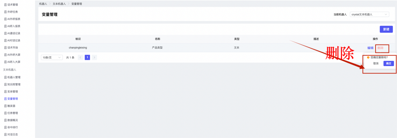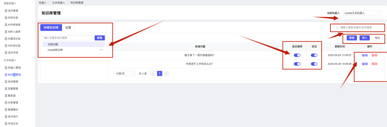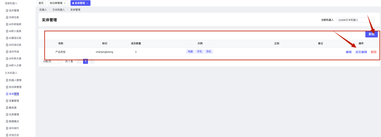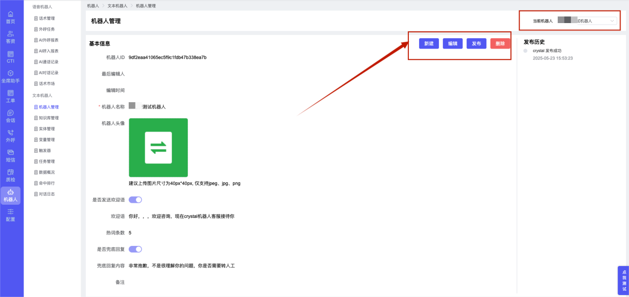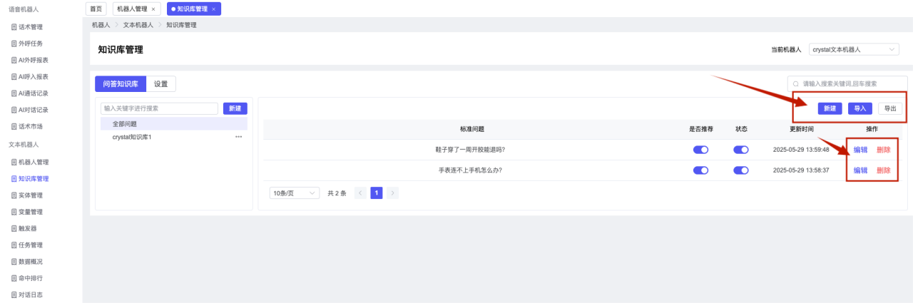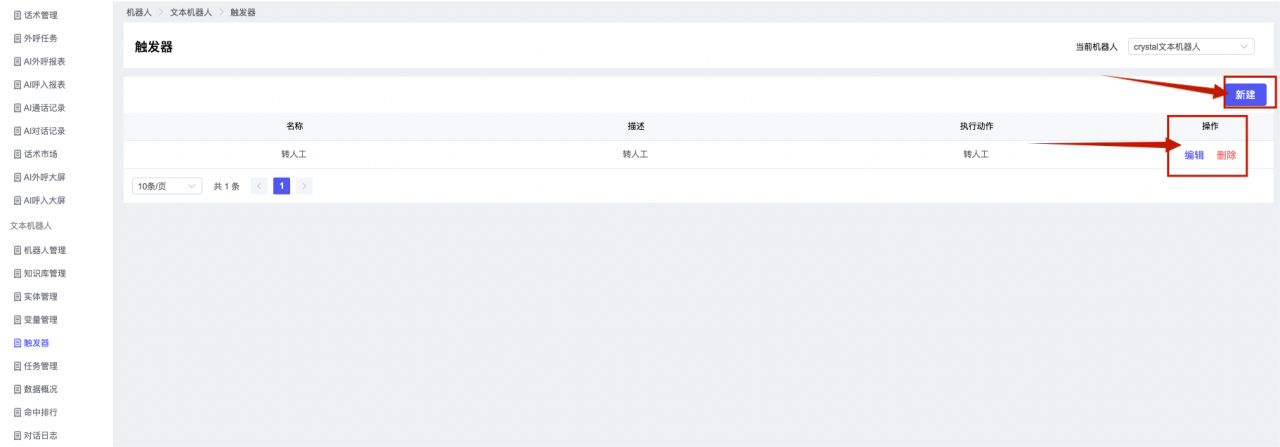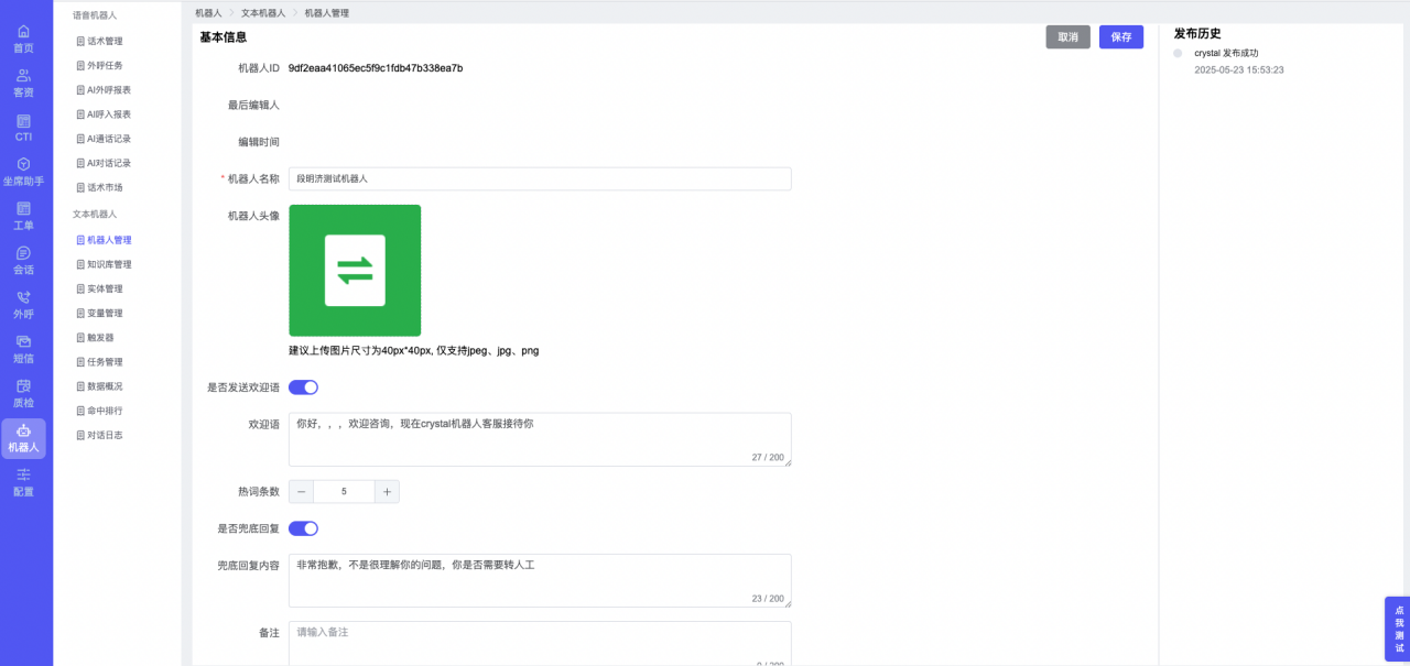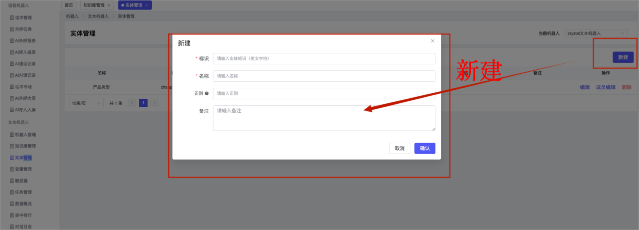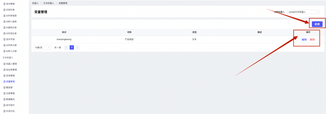## 1、机器人管理 管理机器人账号的,支持新增、编辑、删除、发布等操作,如图  当前机器人:选择当前的机器人可以查看机器人的情况 1)新建:点击新建创建文本机器人,如图  (1) 机器人名称:必填,输入机器人的名称 (2)机器人头像:上传图片,尺寸为40px*40px,支持peg、jpg、png (3)备注:输入机器人的备注信息,最多支持200个字符 2)编辑,点击编辑,如图  基本设置: (1)机器人ID:显示机器人的ID账号 (2)最后编辑人:最近一次编辑的坐席 (3)编辑时间:最近一次编辑的坐席 (4)机器人名称:显示文本机器人的名称 (5)是否发送欢迎语:开启关闭,开启后,输入机器人的欢迎语 (6)是否兜底回复:开启关闭,开启后,输入机器人的兜底回复,当未识别到时进行回复 (7) 备注:显示机器人的备注 3) 发布,点击发布则支持发布最新的文本消息,生成发布历史,如图  4) 删除,点击“删除”该机器人,如图  ## 2、知识库管理 管理知识库的,通过创建知识库分类和知识库问题,答案,当命中知识库问题时会输出答案,如图   ### 1)查询区 关键词:通过搜索标准问题来搜索 ### 2)列表区 (1)标准问题:显示知识库的标准问题的名称 (2)是否推荐:显示知识库是否进行推荐 (3)状态:该知识库是否启用还是禁用,启用则当命中可以正常使用,禁用则不能使用 (4)更新时间:最近一次的编辑知识库的时间,具体到年月日时分秒 (5)更新人:最近一次更新知识库的坐席人员 (6)操作:支持编辑,删除该知识库的操作 ### 3)操作 (1)知识库分类,点击全部分类后的“...”可以添加分类,对知识库分类添加,编辑,删除等操作 点击“新建”如图  可以添加多级分类,点击“...”显示“添加”如图  点击“编辑”如图  点击“删除”如图  (2)知识库列表,如图  1)新建,点击“新建”创建知识库,如图  (1)分类:选择知识库的分类 (2)标准问题:输入知识库的标准问题 (3)相似问:输入问题的相似问,当命中相似问时也会引导出答案,支持全部清空相似问和全部复制相似问 (4)答案:随机回复和全部回复;输入标准问题的答案,可以设置多个,当选择随机回复时则按照添加的答案话术随机回复一句,如果选择的是全部回复则会把所有的答案显示出来。  (5)是否推荐:开启和关闭,开启后支持推荐,关闭则不支持推荐,默认开启 (6)状态:选择是开启还是关闭,开启则可以使用,不开启则不能正常使用 2) 编辑:点击编辑编辑知识库的内容,如图  3) 删除,点击删除弹窗提示“删除该知识库”,如图  (3)导出:支持导出列表的数据信息,点击“导出”如图,在数据下载页面,下载查看  ## 3、实体管理 当需要用到判断节点时,则需要收集到准确的实体信息,需要先添加实体,对实体进行管理,支持新增、编辑、编辑实体、删除的操作,如图  ### 1)列表区 (1)名称:显示实体的名称 (2)标识:显示实体的标识 (3)成员数量:显示成员的数量 (4)示例:显示实体成员 (5)正则:显示实体的正则表达式 (6)备注:显示实体的备注 (7)操作:支持编辑、实体编辑、删除的操作 ### 2)操作 1)新建,点击新建创建实体,如图  (1) 标识:输入实体的标识,j仅支持英文字符 (2) 实体名称:输入实体的名称 (3)正则表达式:输入实体的正则表达式 (4) 备注:输入实体的备注内容 2) 编辑,点击编辑实体名称如图,编辑实体的相关信息  3)编辑实体,点击如图,编辑实体值  点击“新建”如图,创建实体值  名称:输入实体成员的名称 优先级:输入实体成员的优先级,等级越高越优先 同义词:输入实体成员的同义词,如苹果的实体成员,同义词红富士 点击列表中的编辑如图  点击列表中的删除如图  4)点击列表中的“删除”如图,删除该实体  ## 4、变量管理 当需要用到判断节点时,则需要采集变量信息,需要先添加变量,对变量进行管理,支持新增、编辑、删除的操作,如图  ### 1)列表区 (1)标识:显示变量的标识 (2)名称:显示变量的名称 (3)类型:显示变量的类型 (4)描述:显示变量的描述 (5)操作:支持编辑和删除的操作 ### 2)操作 (1)新建:点击“新建”如图,  (2)编辑,点击编辑如图,编辑变量的相关信息  (3) 删除,点击删除如图,删除该变量  ## 5、触发器 对触发条件的管理,支持新建、编辑、删除的操作,设置触发的条件,当条件满足时执行对应的流程和话术  1)新建,点击新建创建触发条件,如图  (1)名称:输入触发器的名称 (2)描述:输入触发器的描述,最多支持80个字符 (3)触发条件:下拉选择触发的条件,下拉值为未知回复、重复提问、总对话轮次、知识库对话轮次、任务流程对话轮次 当条件累计或者连续满足多少次时会执行对应的流程或者话术 (4)执行动作:选择触发条件满足后是执行回复固定话术、还是触发任务流程,或者是转人工的流程 (5)注意:当选择回复固定话术时,则会出现固定话术:则可以输入文本机器人回答的话术;当选择触发任务流程时,则显示任务流程,选择跳转到固定的话术场景去回复;当选择转人工时,选择是转接到坐席还是技能组 回复固定话术,如图  触发任务流程,如图  转人工,如图  ## 6、任务管理 需要涉及到流程对话时则可以创建任务话术,支持对任务的新建、编辑、删除的操作 (1)新建,点击新建,创建任务流程,如图  名称:输入任务流程的名称, 是否启用:默认开启,开启后可以正常触发该任务话术,关闭后则不能正常使用 返回:点击右上角的返回,则返回任务管理页面 画布区:通过拖拉拽以下几个节点进行搭建话术 (2)点击列表中的“编辑”编辑相