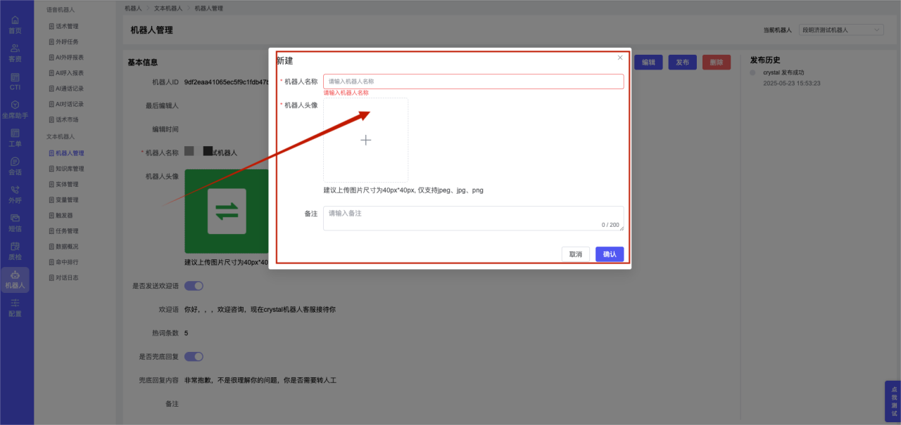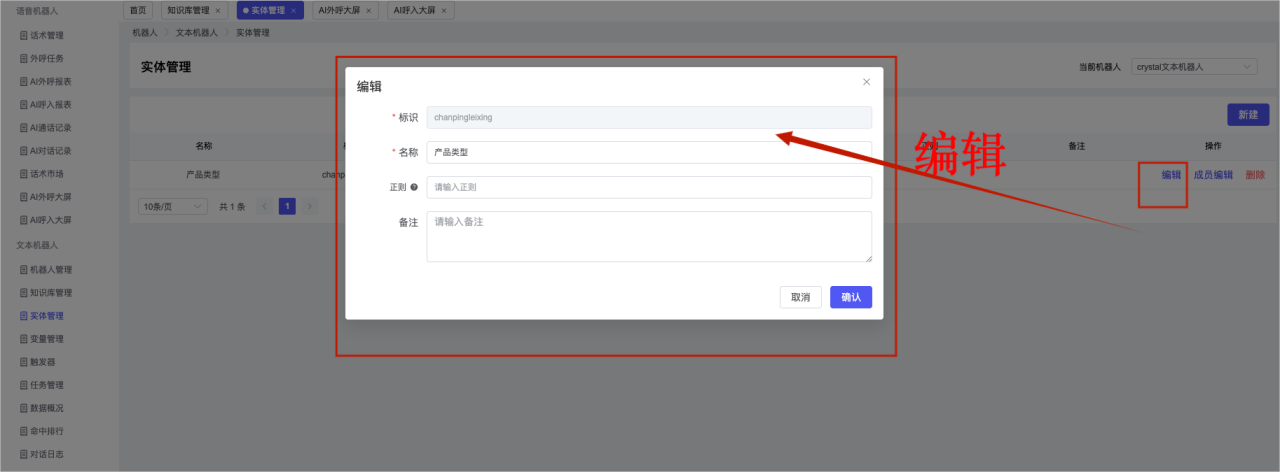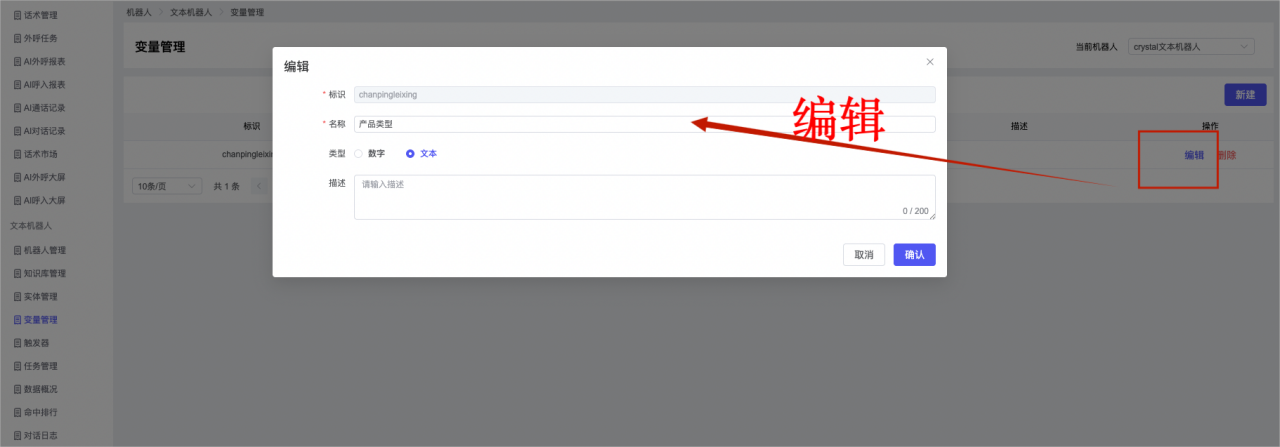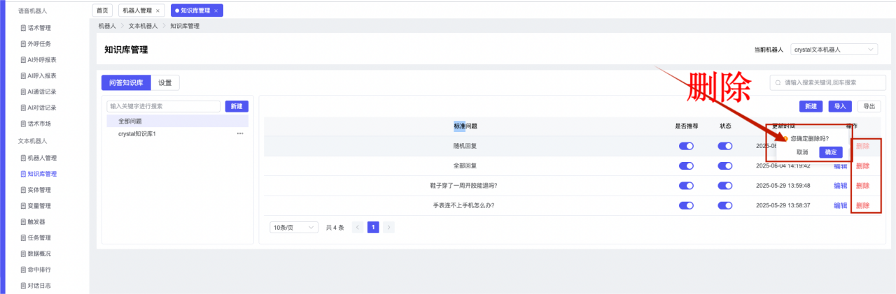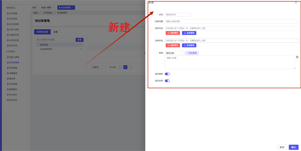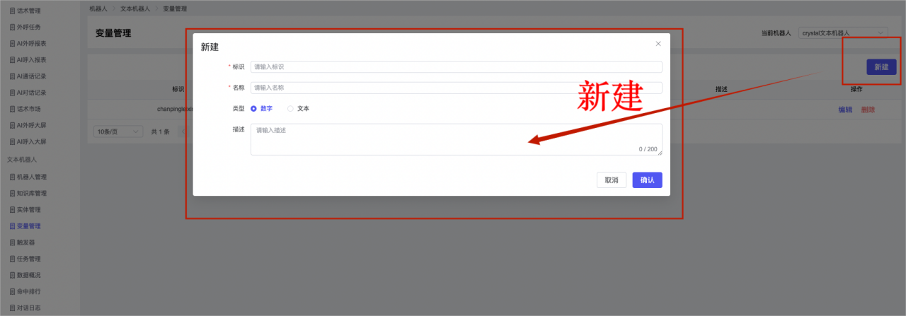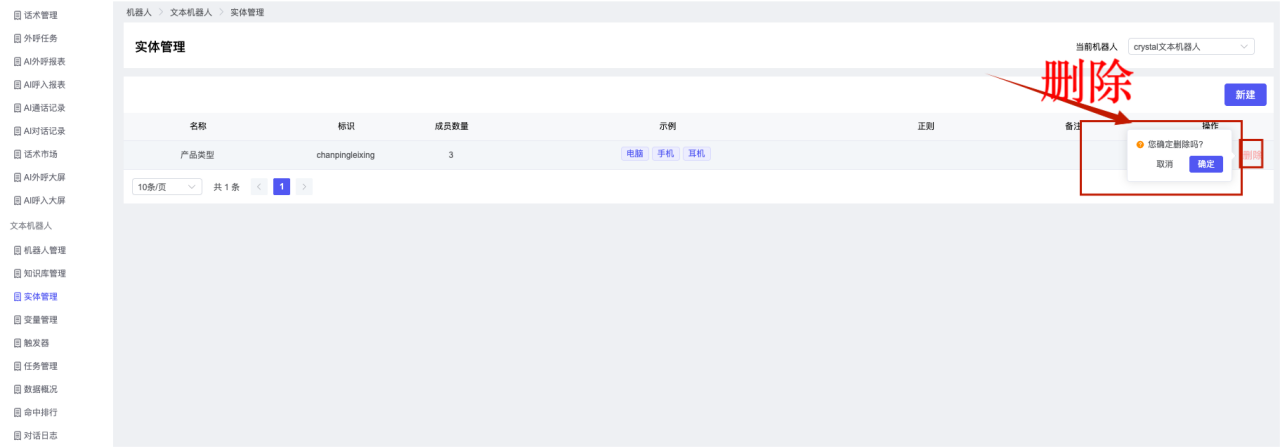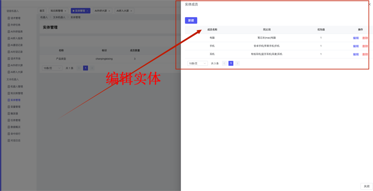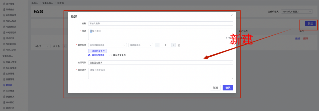 ## 1、机器人管理 管理机器人账号的,支持新增、编辑、删除、发布等操作,如图  当前机器人:选择当前的机器人可以查看机器人的情况 1)新建:点击新建创建文本机器人,如图  (1) 机器人名称:必填,输入机器人的名称 (2)机器人头像:上传图片,尺寸为40px*40px,支持peg、jpg、png (3)备注:输入机器人的备注信息,最多支持200个字符 2)编辑,点击编辑,如图  基本设置: (1)机器人ID:显示机器人的ID账号 (2)最后编辑人:最近一次编辑的坐席 (3)编辑时间:最近一次编辑的坐席 (4)机器人名称:显示文本机器人的名称 (5)是否发送欢迎语:开启关闭,开启后,输入机器人的欢迎语 (6)是否兜底回复:开启关闭,开启后,输入机器人的兜底回复,当未识别到时进行回复 (7) 备注:显示机器人的备注 3) 发布,点击发布则支持发布最新的文本消息,生成发布历史,如图  4) 删除,点击“删除”该机器人,如图  ## 2、知识库管理 管理知识库的,通过创建知识库分类和知识库问题,答案,当命中知识库问题时会输出答案,如图   ### 1)查询区 关键词:通过搜索标准问题来搜索 ### 2)列表区 (1)标准问题:显示知识库的标准问题的名称 (2)是否推荐:显示知识库是否进行推荐 (3)状态:该知识库是否启用还是禁用,启用则当命中可以正常使用,禁用则不能使用 (4)更新时间:最近一次的编辑知识库的时间,具体到年月日时分秒 (5)更新人:最近一次更新知识库的坐席人员 (6)操作:支持编辑,删除该知识库的操作 ### 3)操作 (1)知识库分类,点击全部分类后的“...”可以添加分类,对知识库分类添加,编辑,删除等操作 点击“新建”如图  可以添加多级分类,点击“...”显示“添加”如图  点击“编辑”如图  点击“删除”如图  (2)知识库列表,如图  1)新建,点击“新建”创建知识库,如图  (1)分类:选择知识库的分类 (2)标准问题:输入知识库的标准问题 (3)相似问:输入问题的相似问,当命中相似问时也会引导出答案,支持全部清空相似问和全部复制相似问 (4)答案:随机回复和全部回复;输入标准问题的答案,可以设置多个,当选择随机回复时则按照添加的答案话术随机回复一句,如果选择的是全部回复则会把所有的答案显示出来。  (5)是否推荐:开启和关闭,开启后支持推荐,关闭则不支持推荐,默认开启 (6)状态:选择是开启还是关闭,开启则可以使用,不开启则不能正常使用 2) 编辑:点击编辑编辑知识库的内容,如图  3) 删除,点击删除弹窗提示“删除该知识库”,如图  (3)导出:支持导出列表的数据信息,点击“导出”如图,在数据下载页面,下载查看  ## 3、实体管理 当需要用到判断节点时,则需要收集到准确的实体信息,需要先添加实体,对实体进行管理,支持新增、编辑、编辑实体、删除的操作,如图  ### 1)列表区 (1)名称:显示实体的名称 (2)标识:显示实体的标识 (3)成员数量:显示成员的数量 (4)示例:显示实体成员 (5)正则:显示实体的正则表达式 (6)备注:显示实体的备注 (7)操作:支持编辑、实体编辑、删除的操作 ### 2)操作 1)新建,点击新建创建实体,如图  (1) 标识:输入实体的标识,j仅支持英文字符 (2) 实体名称:输入实体的名称 (3)正则表达式:输入实体的正则表达式 (4) 备注:输入实体的备注内容 2) 编辑,点击编辑实体名称如图,编辑实体的相关信息  3)编辑实体,点击如图,编辑实体值  点击“新建”如图,创建实体值  名称:输入实体成员的名称 优先级:输入实体成员的优先级,等级越高越优先 同义词:输入实体成员的同义词,如苹果的实体成员,同义词红富士 点击列表中的编辑如图  点击列表中的删除如图  4)点击列表中的“删除”如图,删除该实体  ## 4、变量管理 当需要用到判断节点时,则需要采集变量信息,需要先添加变量,对变量进行管理,支持新增、编辑、删除的操作,如图  ### 1)列表区 (1)标识:显示变量的标识 (2)名称:显示变量的名称 (3)类型:显示变量的类型 (4)描述:显示变量的描述 (5)操作:支持编辑和删除的操作 ### 2)操作 (1)新建:点击“新建”如图,  (2)编辑,点击编辑如图,编辑变量的相关信息  (3) 删除,点击删除如图,删除该变量  ## 5、触发器 对触发条件的管理,支持新建、编辑、删除的操作,设置触发的条件,当条件满足时执行对应的流程和话术  1)新建,点击新建创建触发条件,如图  (1)名称:输入触发器的名称 (2)描述:输入触发器的描述,最多支持80个字符 (3)触发条件:下拉选择触发的条件,下拉值为未知回复、重复提问、总对话轮次、知识库对话轮次、任务流程对话轮次 当条件累计或者连续满足多少次时会执行对应的流程或者话术 (4)执行动作:选择触发条件满足后是执行回复固定话术、还是触发任务流程,或者是转人工的流程 (5)注意:当选择回复固定话术时,则会出现固定话术:则可以输入文本机器人回答的话术;当选择触发任务流程时,则显示任务流程,选择跳转到固定的话术场景去回复;当选择转人工时,选择是转接到坐席还是技能组 回复固定话术,如图  触发任务流程,如图  转人工,如图  ## 6、任务管理 需要涉及到流程对话时则可以创建任务话术,支持对任务的新建、编辑、删除的操作 (1)新建,点击新建,创建任务流程,如图  名称:输入任务流程的名称, 是否启用:默认开启,开启后可以正常触发该任务话术,关闭后则不能正常使用 返回:点击右上角的返回,则返回任务管理页面 画布区:通过拖拉拽以下几个节点进行搭建话术 (2)点击列表中的“编辑”编辑相