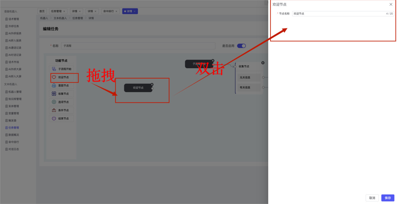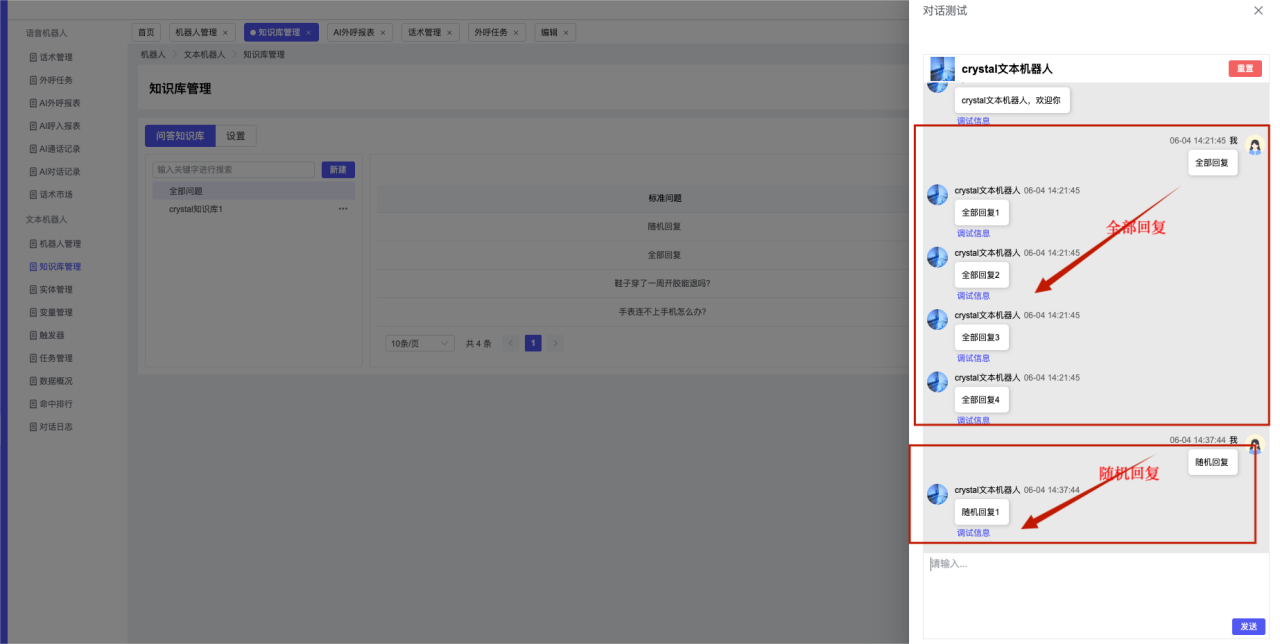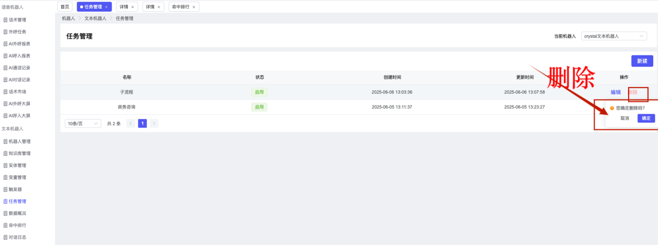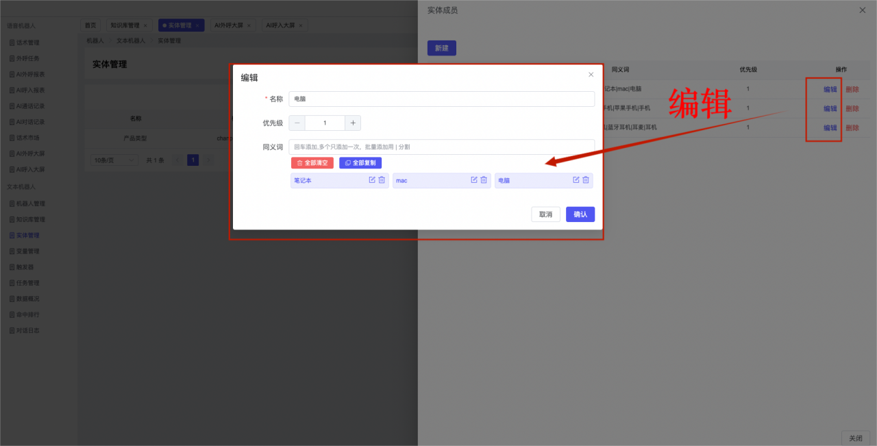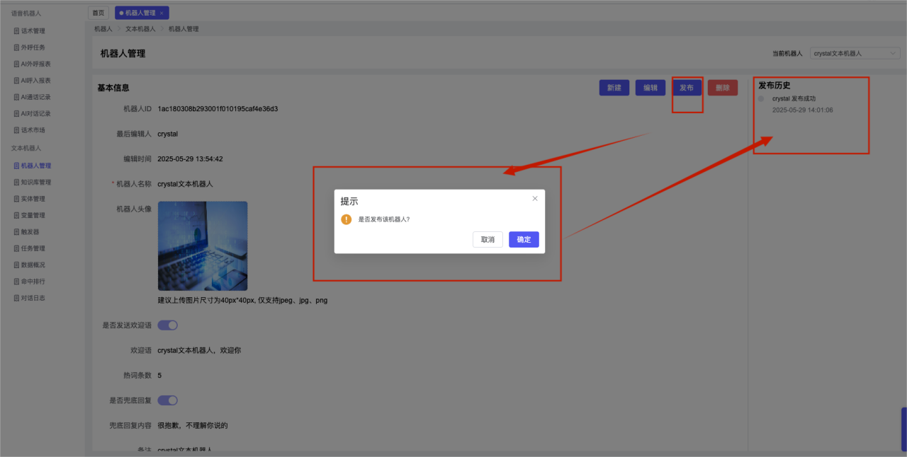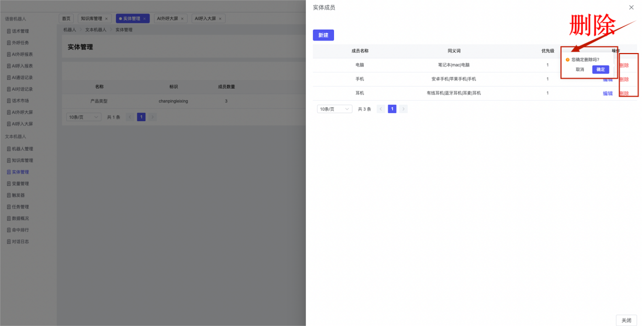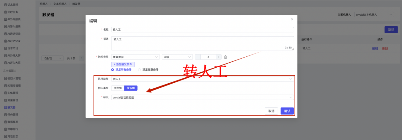 ## 1、机器人管理 管理机器人账号的,支持新增、编辑、删除、发布等操作,如图  当前机器人:选择当前的机器人可以查看机器人的情况 1)新建:点击新建创建文本机器人,如图  (1) 机器人名称:必填,输入机器人的名称 (2)机器人头像:上传图片,尺寸为40px*40px,支持peg、jpg、png (3)备注:输入机器人的备注信息,最多支持200个字符 2)编辑,点击编辑,如图  基本设置: (1)机器人ID:显示机器人的ID账号 (2)最后编辑人:最近一次编辑的坐席 (3)编辑时间:最近一次编辑的坐席 (4)机器人名称:显示文本机器人的名称 (5)是否发送欢迎语:开启关闭,开启后,输入机器人的欢迎语 (6)是否兜底回复:开启关闭,开启后,输入机器人的兜底回复,当未识别到时进行回复 (7) 备注:显示机器人的备注 3) 发布,点击发布则支持发布最新的文本消息,生成发布历史,如图  4) 删除,点击“删除”该机器人,如图  ## 2、知识库管理 管理知识库的,通过创建知识库分类和知识库问题,答案,当命中知识库问题时会输出答案,如图   ### 1)查询区 关键词:通过搜索标准问题来搜索 ### 2)列表区 (1)标准问题:显示知识库的标准问题的名称 (2)是否推荐:显示知识库是否进行推荐 (3)状态:该知识库是否启用还是禁用,启用则当命中可以正常使用,禁用则不能使用 (4)更新时间:最近一次的编辑知识库的时间,具体到年月日时分秒 (5)更新人:最近一次更新知识库的坐席人员 (6)操作:支持编辑,删除该知识库的操作 ### 3)操作 (1)知识库分类,点击全部分类后的“...”可以添加分类,对知识库分类添加,编辑,删除等操作 点击“新建”如图  可以添加多级分类,点击“...”显示“添加”如图  点击“编辑”如图  点击“删除”如图  (2)知识库列表,如图  1)新建,点击“新建”创建知识库,如图  (1)分类:选择知识库的分类 (2)标准问题:输入知识库的标准问题 (3)相似问:输入问题的相似问,当命中相似问时也会引导出答案,支持全部清空相似问和全部复制相似问 (4)答案:随机回复和全部回复;输入标准问题的答案,可以设置多个,当选择随机回复时则按照添加的答案话术随机回复一句,如果选择的是全部回复则会把所有的答案显示出来。  (5)是否推荐:开启和关闭,开启后支持推荐,关闭则不支持推荐,默认开启 (6)状态:选择是开启还是关闭,开启则可以使用,不开启则不能正常使用 2) 编辑:点击编辑编辑知识库的内容,如图  3) 删除,点击删除弹窗提示“删除该知识库”,如图  (3)导出:支持导出列表的数据信息,点击“导出”如图,在数据下载页面,下载查看  ## 3、实体管理 当需要用到判断节点时,则需要收集到准确的实体信息,需要先添加实体,对实体进行管理,支持新增、编辑、编辑实体、删除的操作,如图  ### 1)列表区 (1)名称:显示实体的名称 (2)标识:显示实体的标识 (3)成员数量:显示成员的数量 (4)示例:显示实体成员 (5)正则:显示实体的正则表达式 (6)备注:显示实体的备注 (7)操作:支持编辑、实体编辑、删除的操作 ### 2)操作 1)新建,点击新建创建实体,如图  (1) 标识:输入实体的标识,j仅支持英文字符 (2) 实体名称:输入实体的名称 (3)正则表达式:输入实体的正则表达式 (4) 备注:输入实体的备注内容 2) 编辑,点击编辑实体名称如图,编辑实体的相关信息  3)编辑实体,点击如图,编辑实体值  点击“新建”如图,创建实体值  名称:输入实体成员的名称 优先级:输入实体成员的优先级,等级越高越优先 同义词:输入实体成员的同义词,如苹果的实体成员,同义词红富士 点击列表中的编辑如图  点击列表中的删除如图  4)点击列表中的“删除”如图,删除该实体  ## 4、变量管理 当需要用到判断节点时,则需要采集变量信息,需要先添加变量,对变量进行管理,支持新增、编辑、删除的操作,如图  ### 1)列表区 (1)标识:显示变量的标识 (2)名称:显示变量的名称 (3)类型:显示变量的类型 (4)描述:显示变量的描述 (5)操作:支持编辑和删除的操作 ### 2)操作 (1)新建:点击“新建”如图,  (2)编辑,点击编辑如图,编辑变量的相关信息  (3) 删除,点击删除如图,删除该变量  ## 5、触发器 对触发条件的管理,支持新建、编辑、删除的操作,设置触发的条件,当条件满足时执行对应的流程和话术  1)新建,点击新建创建触发条件,如图  (1)名称:输入触发器的名称 (2)描述:输入触发器的描述,最多支持80个字符 (3)触发条件:下拉选择触发的条件,下拉值为未知回复、重复提问、总对话轮次、知识库对话轮次、任务流程对话轮次 当条件累计或者连续满足多少次时会执行对应的流程或者话术 (4)执行动作:选择触发条件满足后是执行回复固定话术、还是触发任务流程,或者是转人工的流程 (5)注意:当选择回复固定话术时,则会出现固定话术:则可以输入文本机器人回答的话术;当选择触发任务流程时,则显示任务流程,选择跳转到固定的话术场景去回复;当选择转人工时,选择是转接到坐席还是技能组 回复固定话术,如图  触发任务流程,如图  转人工,如图  ## 6、任务管理 需要涉及到流程对话时则可以创建任务话术,支持对任务的新建、编辑、删除的操作 (1)新建,点击新建,创建任务流程,如图  名称:输入任务流程的名称, 是否启用:默认开启,开启后可以正常触发该任务话术,关闭后则不能正常使用 返回:点击右上角的返回,则返回任务管理页面 画布区:通过拖拉拽以下几个节点进行搭建话术 (2)点击列表中的“编辑”编辑相