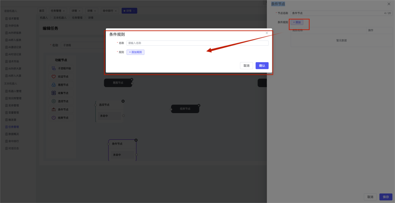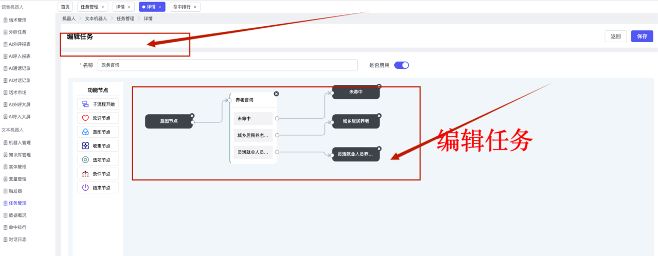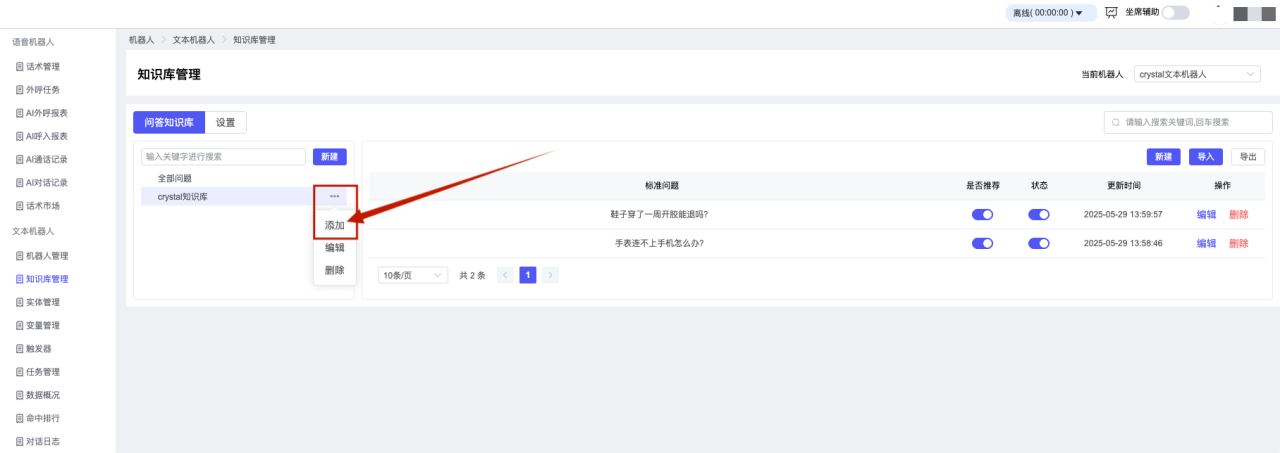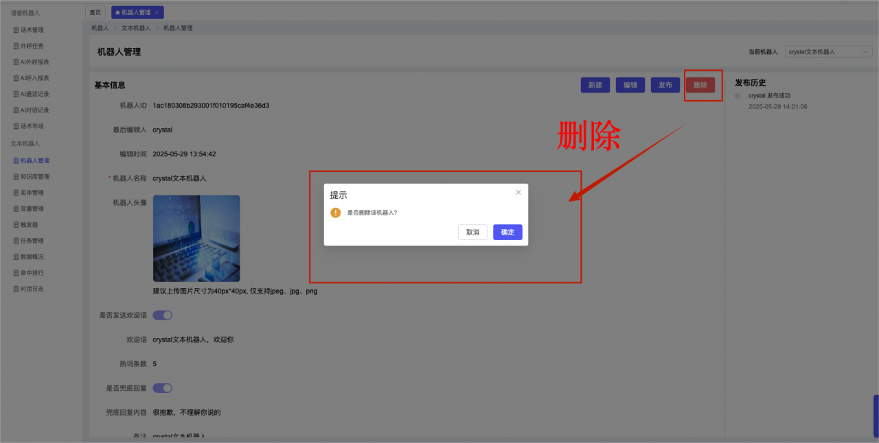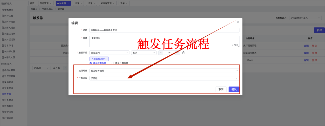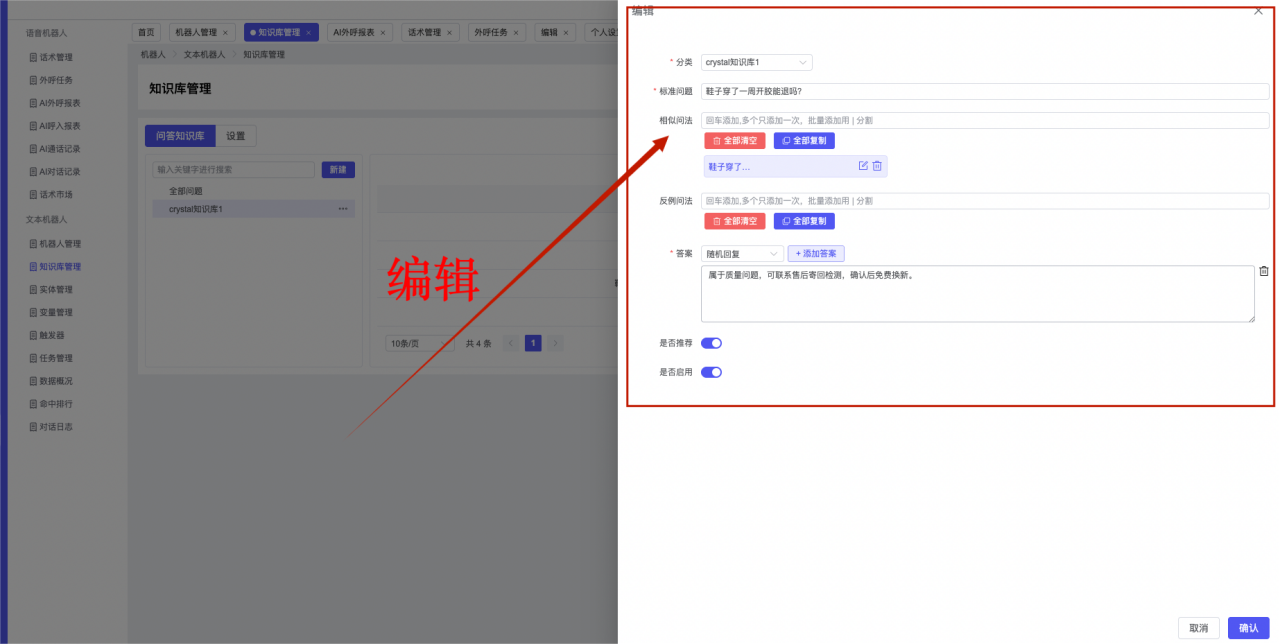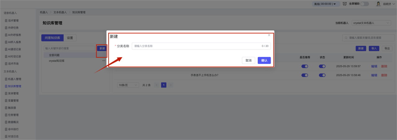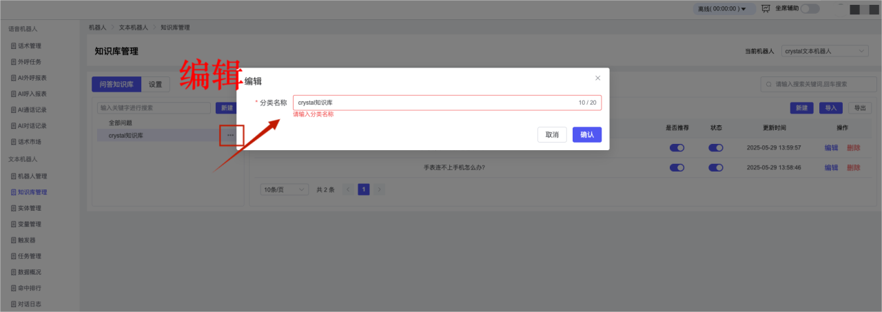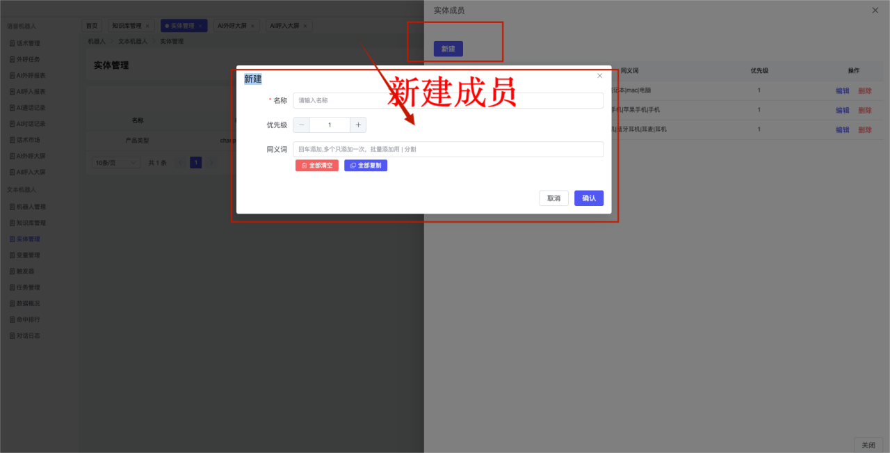 ## 1、机器人管理 管理机器人账号的,支持新增、编辑、删除、发布等操作,如图  当前机器人:选择当前的机器人可以查看机器人的情况 1)新建:点击新建创建文本机器人,如图  (1) 机器人名称:必填,输入机器人的名称 (2)机器人头像:上传图片,尺寸为40px*40px,支持peg、jpg、png (3)备注:输入机器人的备注信息,最多支持200个字符 2)编辑,点击编辑,如图  基本设置: (1)机器人ID:显示机器人的ID账号 (2)最后编辑人:最近一次编辑的坐席 (3)编辑时间:最近一次编辑的坐席 (4)机器人名称:显示文本机器人的名称 (5)是否发送欢迎语:开启关闭,开启后,输入机器人的欢迎语 (6)是否兜底回复:开启关闭,开启后,输入机器人的兜底回复,当未识别到时进行回复 (7) 备注:显示机器人的备注 3) 发布,点击发布则支持发布最新的文本消息,生成发布历史,如图  4) 删除,点击“删除”该机器人,如图  ## 2、知识库管理 管理知识库的,通过创建知识库分类和知识库问题,答案,当命中知识库问题时会输出答案,如图   ### 1)查询区 关键词:通过搜索标准问题来搜索 ### 2)列表区 (1)标准问题:显示知识库的标准问题的名称 (2)是否推荐:显示知识库是否进行推荐 (3)状态:该知识库是否启用还是禁用,启用则当命中可以正常使用,禁用则不能使用 (4)更新时间:最近一次的编辑知识库的时间,具体到年月日时分秒 (5)更新人:最近一次更新知识库的坐席人员 (6)操作:支持编辑,删除该知识库的操作 ### 3)操作 (1)知识库分类,点击全部分类后的“...”可以添加分类,对知识库分类添加,编辑,删除等操作 点击“新建”如图  可以添加多级分类,点击“...”显示“添加”如图  点击“编辑”如图  点击“删除”如图  (2)知识库列表,如图  1)新建,点击“新建”创建知识库,如图  (1)分类:选择知识库的分类 (2)标准问题:输入知识库的标准问题 (3)相似问:输入问题的相似问,当命中相似问时也会引导出答案,支持全部清空相似问和全部复制相似问 (4)答案:随机回复和全部回复;输入标准问题的答案,可以设置多个,当选择随机回复时则按照添加的答案话术随机回复一句,如果选择的是全部回复则会把所有的答案显示出来。  (5)是否推荐:开启和关闭,开启后支持推荐,关闭则不支持推荐,默认开启 (6)状态:选择是开启还是关闭,开启则可以使用,不开启则不能正常使用 2) 编辑:点击编辑编辑知识库的内容,如图  3) 删除,点击删除弹窗提示“删除该知识库”,如图  (3)导出:支持导出列表的数据信息,点击“导出”如图,在数据下载页面,下载查看  ## 3、实体管理 当需要用到判断节点时,则需要收集到准确的实体信息,需要先添加实体,对实体进行管理,支持新增、编辑、编辑实体、删除的操作,如图  ### 1)列表区 (1)名称:显示实体的名称 (2)标识:显示实体的标识 (3)成员数量:显示成员的数量 (4)示例:显示实体成员 (5)正则:显示实体的正则表达式 (6)备注:显示实体的备注 (7)操作:支持编辑、实体编辑、删除的操作 ### 2)操作 1)新建,点击新建创建实体,如图  (1) 标识:输入实体的标识,j仅支持英文字符 (2) 实体名称:输入实体的名称 (3)正则表达式:输入实体的正则表达式 (4) 备注:输入实体的备注内容 2) 编辑,点击编辑实体名称如图,编辑实体的相关信息  3)编辑实体,点击如图,编辑实体值  点击“新建”如图,创建实体值  名称:输入实体成员的名称 优先级:输入实体成员的优先级,等级越高越优先 同义词:输入实体成员的同义词,如苹果的实体成员,同义词红富士 点击列表中的编辑如图  点击列表中的删除如图  4)点击列表中的“删除”如图,删除该实体  ## 4、变量管理 当需要用到判断节点时,则需要采集变量信息,需要先添加变量,对变量进行管理,支持新增、编辑、删除的操作,如图  ### 1)列表区 (1)标识:显示变量的标识 (2)名称:显示变量的名称 (3)类型:显示变量的类型 (4)描述:显示变量的描述 (5)操作:支持编辑和删除的操作 ### 2)操作 (1)新建:点击“新建”如图,  (2)编辑,点击编辑如图,编辑变量的相关信息  (3) 删除,点击删除如图,删除该变量  ## 5、触发器 对触发条件的管理,支持新建、编辑、删除的操作,设置触发的条件,当条件满足时执行对应的流程和话术  1)新建,点击新建创建触发条件,如图  (1)名称:输入触发器的名称 (2)描述:输入触发器的描述,最多支持80个字符 (3)触发条件:下拉选择触发的条件,下拉值为未知回复、重复提问、总对话轮次、知识库对话轮次、任务流程对话轮次 当条件累计或者连续满足多少次时会执行对应的流程或者话术 (4)执行动作:选择触发条件满足后是执行回复固定话术、还是触发任务流程,或者是转人工的流程 (5)注意:当选择回复固定话术时,则会出现固定话术:则可以输入文本机器人回答的话术;当选择触发任务流程时,则显示任务流程,选择跳转到固定的话术场景去回复;当选择转人工时,选择是转接到坐席还是技能组 回复固定话术,如图  触发任务流程,如图  转人工,如图  ## 6、任务管理 需要涉及到流程对话时则可以创建任务话术,支持对任务的新建、编辑、删除的操作 (1)新建,点击新建,创建任务流程,如图  名称:输入任务流程的名称, 是否启用:默认开启,开启后可以正常触发该任务话术,关闭后则不能正常使用 返回:点击右上角的返回,则返回任务管理页面 画布区:通过拖拉拽以下几个节点进行搭建话术 (2)点击列表中的“编辑”编辑相