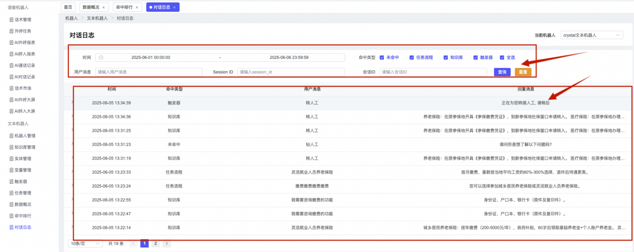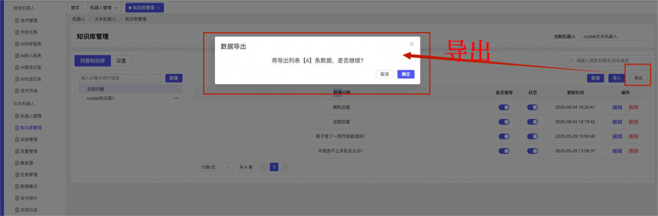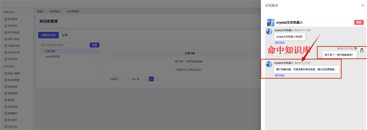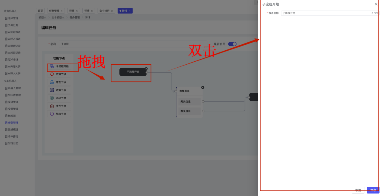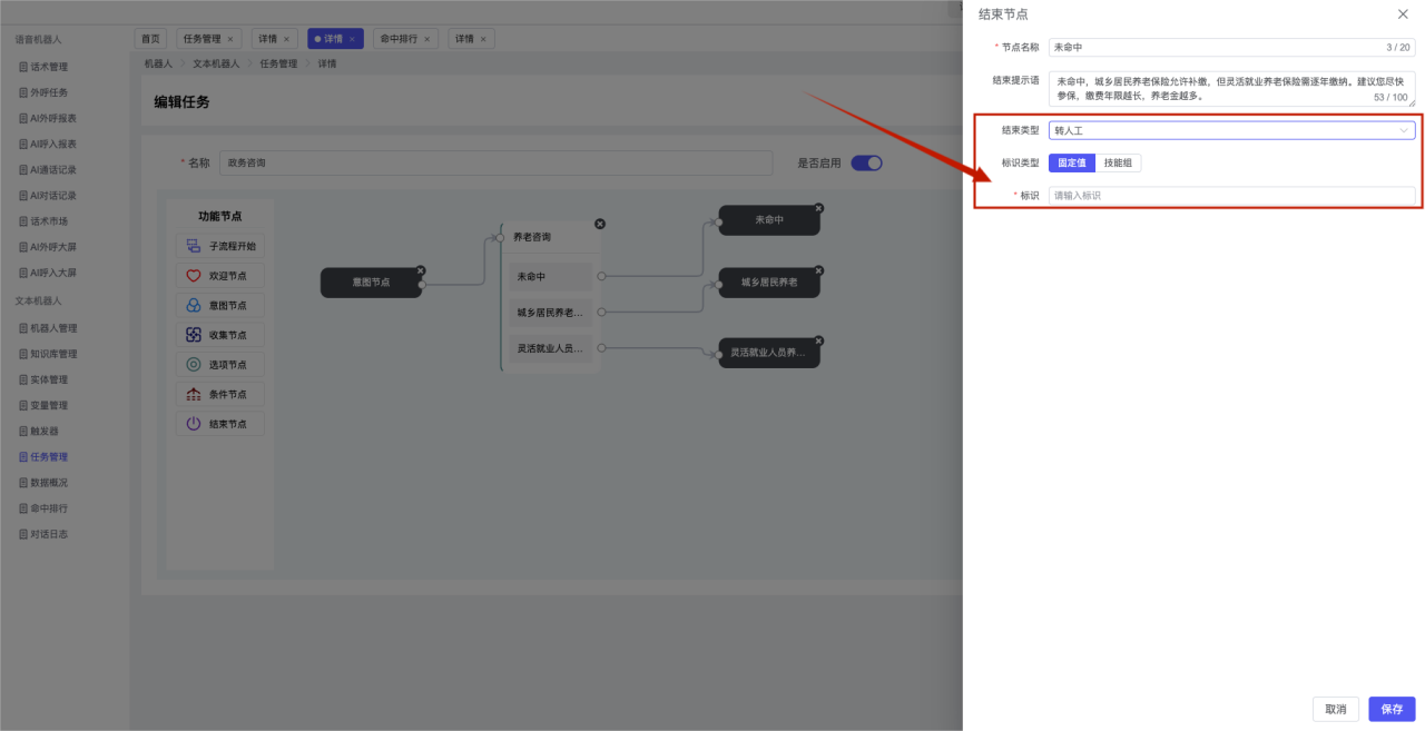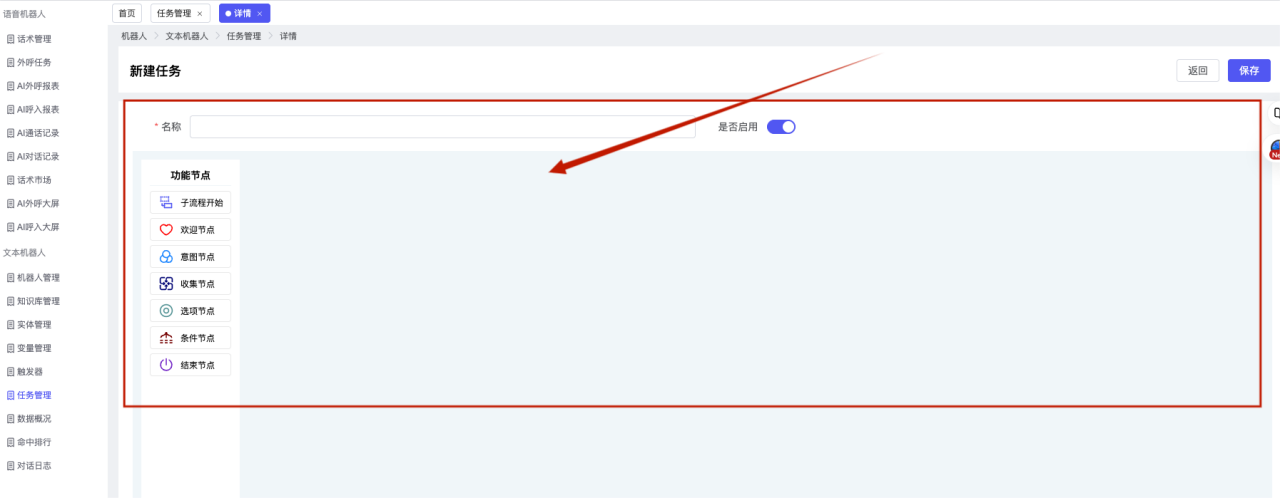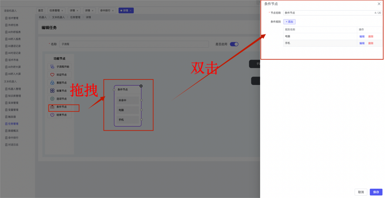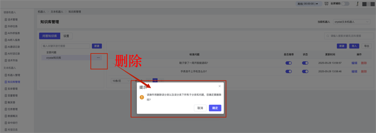## 1、机器人管理 管理机器人账号的,支持新增、编辑、删除、发布等操作,如图  当前机器人:选择当前的机器人可以查看机器人的情况 1)新建:点击新建创建文本机器人,如图  (1) 机器人名称:必填,输入机器人的名称 (2)机器人头像:上传图片,尺寸为40px*40px,支持peg、jpg、png (3)备注:输入机器人的备注信息,最多支持200个字符 2)编辑,点击编辑,如图  基本设置: (1)机器人ID:显示机器人的ID账号 (2)最后编辑人:最近一次编辑的坐席 (3)编辑时间:最近一次编辑的坐席 (4)机器人名称:显示文本机器人的名称 (5)是否发送欢迎语:开启关闭,开启后,输入机器人的欢迎语 (6)是否兜底回复:开启关闭,开启后,输入机器人的兜底回复,当未识别到时进行回复 (7) 备注:显示机器人的备注 3) 发布,点击发布则支持发布最新的文本消息,生成发布历史,如图  4) 删除,点击“删除”该机器人,如图  ## 2、知识库管理 管理知识库的,通过创建知识库分类和知识库问题,答案,当命中知识库问题时会输出答案,如图   ### 1)查询区 关键词:通过搜索标准问题来搜索 ### 2)列表区 (1)标准问题:显示知识库的标准问题的名称 (2)是否推荐:显示知识库是否进行推荐 (3)状态:该知识库是否启用还是禁用,启用则当命中可以正常使用,禁用则不能使用 (4)更新时间:最近一次的编辑知识库的时间,具体到年月日时分秒 (5)更新人:最近一次更新知识库的坐席人员 (6)操作:支持编辑,删除该知识库的操作 ### 3)操作 (1)知识库分类,点击全部分类后的“...”可以添加分类,对知识库分类添加,编辑,删除等操作 点击“新建”如图  可以添加多级分类,点击“...”显示“添加”如图  点击“编辑”如图  点击“删除”如图  (2)知识库列表,如图  1)新建,点击“新建”创建知识库,如图  (1)分类:选择知识库的分类 (2)标准问题:输入知识库的标准问题 (3)相似问:输入问题的相似问,当命中相似问时也会引导出答案,支持全部清空相似问和全部复制相似问 (4)答案:随机回复和全部回复;输入标准问题的答案,可以设置多个,当选择随机回复时则按照添加的答案话术随机回复一句,如果选择的是全部回复则会把所有的答案显示出来。  (5)是否推荐:开启和关闭,开启后支持推荐,关闭则不支持推荐,默认开启 (6)状态:选择是开启还是关闭,开启则可以使用,不开启则不能正常使用 2) 编辑:点击编辑编辑知识库的内容,如图  3) 删除,点击删除弹窗提示“删除该知识库”,如图  (3)导出:支持导出列表的数据信息,点击“导出”如图,在数据下载页面,下载查看  ## 3、实体管理 当需要用到判断节点时,则需要收集到准确的实体信息,需要先添加实体,对实体进行管理,支持新增、编辑、编辑实体、删除的操作,如图  ### 1)列表区 (1)名称:显示实体的名称 (2)标识:显示实体的标识 (3)成员数量:显示成员的数量 (4)示例:显示实体成员 (5)正则:显示实体的正则表达式 (6)备注:显示实体的备注 (7)操作:支持编辑、实体编辑、删除的操作 ### 2)操作 1)新建,点击新建创建实体,如图  (1) 标识:输入实体的标识,j仅支持英文字符 (2) 实体名称:输入实体的名称 (3)正则表达式:输入实体的正则表达式 (4) 备注:输入实体的备注内容 2) 编辑,点击编辑实体名称如图,编辑实体的相关信息  3)编辑实体,点击如图,编辑实体值  点击“新建”如图,创建实体值  名称:输入实体成员的名称 优先级:输入实体成员的优先级,等级越高越优先 同义词:输入实体成员的同义词,如苹果的实体成员,同义词红富士 点击列表中的编辑如图  点击列表中的删除如图  4)点击列表中的“删除”如图,删除该实体  ## 4、变量管理 当需要用到判断节点时,则需要采集变量信息,需要先添加变量,对变量进行管理,支持新增、编辑、删除的操作,如图  ### 1)列表区 (1)标识:显示变量的标识 (2)名称:显示变量的名称 (3)类型:显示变量的类型 (4)描述:显示变量的描述 (5)操作:支持编辑和删除的操作 ### 2)操作 (1)新建:点击“新建”如图,  (2)编辑,点击编辑如图,编辑变量的相关信息  (3) 删除,点击删除如图,删除该变量  ## 5、触发器 对触发条件的管理,支持新建、编辑、删除的操作,设置触发的条件,当条件满足时执行对应的流程和话术  1)新建,点击新建创建触发条件,如图  (1)名称:输入触发器的名称 (2)描述:输入触发器的描述,最多支持80个字符 (3)触发条件:下拉选择触发的条件,下拉值为未知回复、重复提问、总对话轮次、知识库对话轮次、任务流程对话轮次 当条件累计或者连续满足多少次时会执行对应的流程或者话术 (4)执行动作:选择触发条件满足后是执行回复固定话术、还是触发任务流程,或者是转人工的流程 (5)注意:当选择回复固定话术时,则会出现固定话术:则可以输入文本机器人回答的话术;当选择触发任务流程时,则显示任务流程,选择跳转到固定的话术场景去回复;当选择转人工时,选择是转接到坐席还是技能组 回复固定话术,如图  触发任务流程,如图  转人工,如图  ## 6、任务管理 需要涉及到流程对话时则可以创建任务话术,支持对任务的新建、编辑、删除的操作 (1)新建,点击新建,创建任务流程,如图  名称:输入任务流程的名称, 是否启用:默认开启,开启后可以正常触发该任务话术,关闭后则不能正常使用 返回:点击右上角的返回,则返回任务管理页面 画布区:通过拖拉拽以下几个节点进行搭建话术 (2)点击列表中的“编辑”编辑相