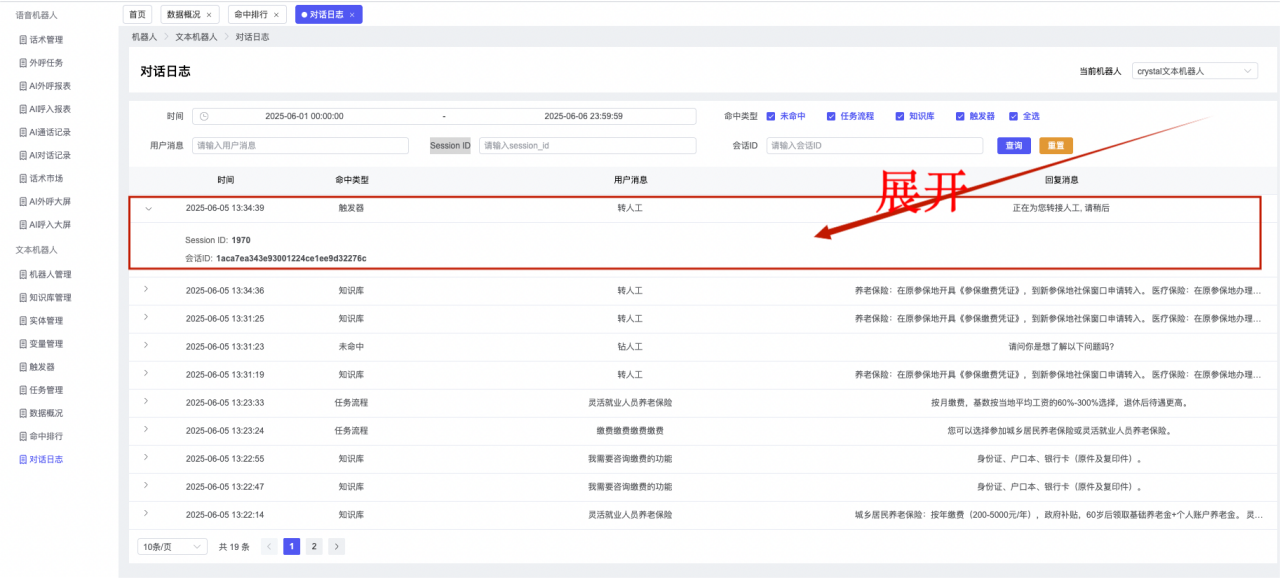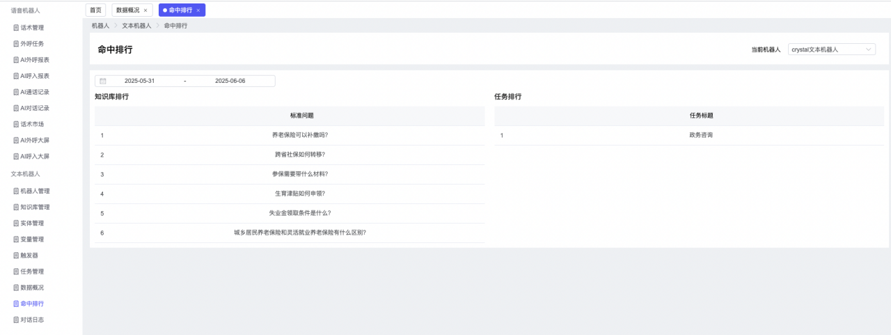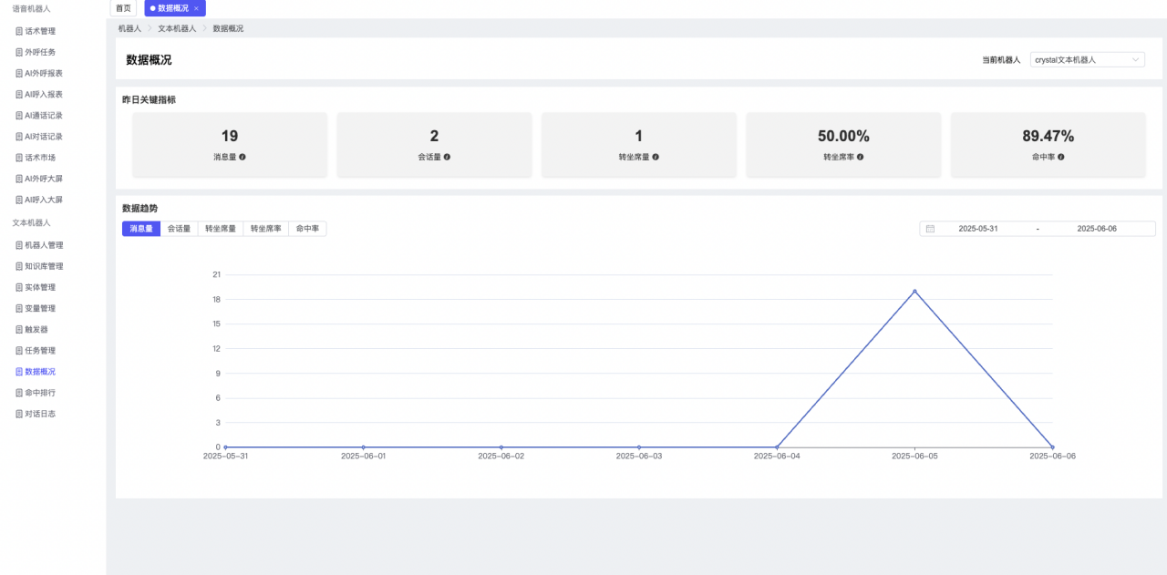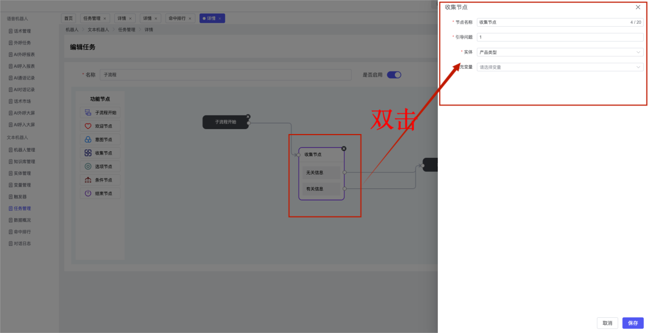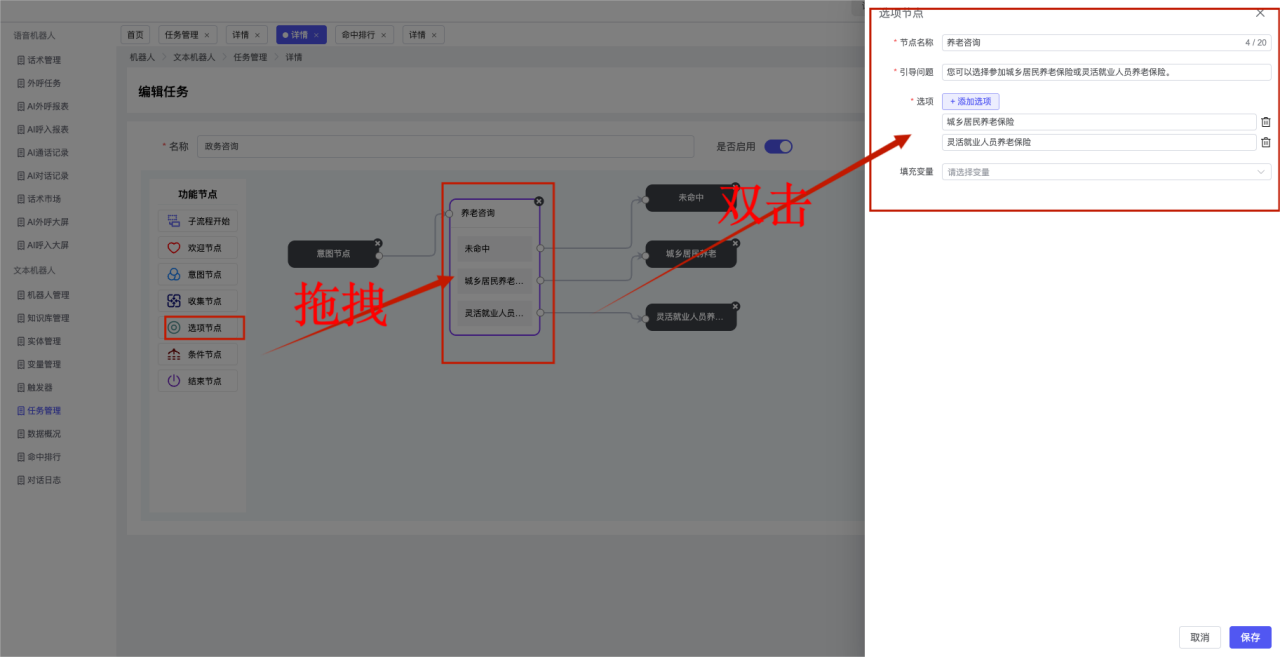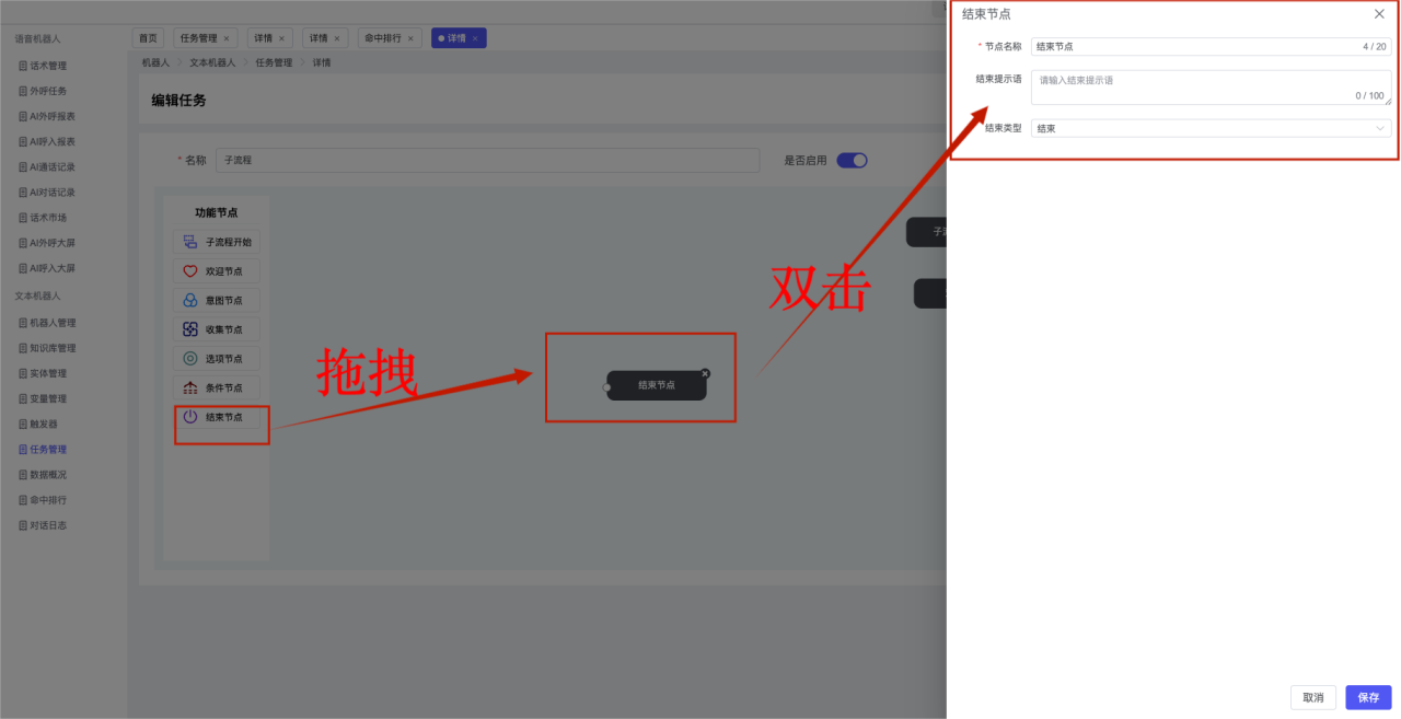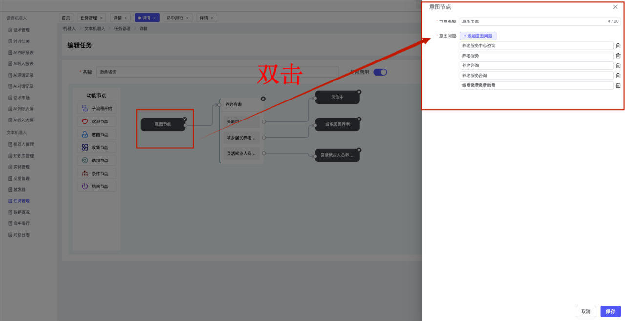 ## 1、机器人管理 管理机器人账号的,支持新增、编辑、删除、发布等操作,如图  当前机器人:选择当前的机器人可以查看机器人的情况 1)新建:点击新建创建文本机器人,如图  (1) 机器人名称:必填,输入机器人的名称 (2)机器人头像:上传图片,尺寸为40px*40px,支持peg、jpg、png (3)备注:输入机器人的备注信息,最多支持200个字符 2)编辑,点击编辑,如图  基本设置: (1)机器人ID:显示机器人的ID账号 (2)最后编辑人:最近一次编辑的坐席 (3)编辑时间:最近一次编辑的坐席 (4)机器人名称:显示文本机器人的名称 (5)是否发送欢迎语:开启关闭,开启后,输入机器人的欢迎语 (6)是否兜底回复:开启关闭,开启后,输入机器人的兜底回复,当未识别到时进行回复 (7) 备注:显示机器人的备注 3) 发布,点击发布则支持发布最新的文本消息,生成发布历史,如图  4) 删除,点击“删除”该机器人,如图  ## 2、知识库管理 管理知识库的,通过创建知识库分类和知识库问题,答案,当命中知识库问题时会输出答案,如图   ### 1)查询区 关键词:通过搜索标准问题来搜索 ### 2)列表区 (1)标准问题:显示知识库的标准问题的名称 (2)是否推荐:显示知识库是否进行推荐 (3)状态:该知识库是否启用还是禁用,启用则当命中可以正常使用,禁用则不能使用 (4)更新时间:最近一次的编辑知识库的时间,具体到年月日时分秒 (5)更新人:最近一次更新知识库的坐席人员 (6)操作:支持编辑,删除该知识库的操作 ### 3)操作 (1)知识库分类,点击全部分类后的“...”可以添加分类,对知识库分类添加,编辑,删除等操作 点击“新建”如图  可以添加多级分类,点击“...”显示“添加”如图  点击“编辑”如图  点击“删除”如图  (2)知识库列表,如图  1)新建,点击“新建”创建知识库,如图  (1)分类:选择知识库的分类 (2)标准问题:输入知识库的标准问题 (3)相似问:输入问题的相似问,当命中相似问时也会引导出答案,支持全部清空相似问和全部复制相似问 (4)答案:随机回复和全部回复;输入标准问题的答案,可以设置多个,当选择随机回复时则按照添加的答案话术随机回复一句,如果选择的是全部回复则会把所有的答案显示出来。  (5)是否推荐:开启和关闭,开启后支持推荐,关闭则不支持推荐,默认开启 (6)状态:选择是开启还是关闭,开启则可以使用,不开启则不能正常使用 2) 编辑:点击编辑编辑知识库的内容,如图  3) 删除,点击删除弹窗提示“删除该知识库”,如图  (3)导出:支持导出列表的数据信息,点击“导出”如图,在数据下载页面,下载查看  ## 3、实体管理 当需要用到判断节点时,则需要收集到准确的实体信息,需要先添加实体,对实体进行管理,支持新增、编辑、编辑实体、删除的操作,如图  ### 1)列表区 (1)名称:显示实体的名称 (2)标识:显示实体的标识 (3)成员数量:显示成员的数量 (4)示例:显示实体成员 (5)正则:显示实体的正则表达式 (6)备注:显示实体的备注 (7)操作:支持编辑、实体编辑、删除的操作 ### 2)操作 1)新建,点击新建创建实体,如图  (1) 标识:输入实体的标识,j仅支持英文字符 (2) 实体名称:输入实体的名称 (3)正则表达式:输入实体的正则表达式 (4) 备注:输入实体的备注内容 2) 编辑,点击编辑实体名称如图,编辑实体的相关信息  3)编辑实体,点击如图,编辑实体值  点击“新建”如图,创建实体值  名称:输入实体成员的名称 优先级:输入实体成员的优先级,等级越高越优先 同义词:输入实体成员的同义词,如苹果的实体成员,同义词红富士 点击列表中的编辑如图  点击列表中的删除如图  4)点击列表中的“删除”如图,删除该实体  ## 4、变量管理 当需要用到判断节点时,则需要采集变量信息,需要先添加变量,对变量进行管理,支持新增、编辑、删除的操作,如图  ### 1)列表区 (1)标识:显示变量的标识 (2)名称:显示变量的名称 (3)类型:显示变量的类型 (4)描述:显示变量的描述 (5)操作:支持编辑和删除的操作 ### 2)操作 (1)新建:点击“新建”如图,  (2)编辑,点击编辑如图,编辑变量的相关信息  (3) 删除,点击删除如图,删除该变量  ## 5、触发器 对触发条件的管理,支持新建、编辑、删除的操作,设置触发的条件,当条件满足时执行对应的流程和话术  1)新建,点击新建创建触发条件,如图  (1)名称:输入触发器的名称 (2)描述:输入触发器的描述,最多支持80个字符 (3)触发条件:下拉选择触发的条件,下拉值为未知回复、重复提问、总对话轮次、知识库对话轮次、任务流程对话轮次 当条件累计或者连续满足多少次时会执行对应的流程或者话术 (4)执行动作:选择触发条件满足后是执行回复固定话术、还是触发任务流程,或者是转人工的流程 (5)注意:当选择回复固定话术时,则会出现固定话术:则可以输入文本机器人回答的话术;当选择触发任务流程时,则显示任务流程,选择跳转到固定的话术场景去回复;当选择转人工时,选择是转接到坐席还是技能组 回复固定话术,如图  触发任务流程,如图  转人工,如图  ## 6、任务管理 需要涉及到流程对话时则可以创建任务话术,支持对任务的新建、编辑、删除的操作 (1)新建,点击新建,创建任务流程,如图  名称:输入任务流程的名称, 是否启用:默认开启,开启后可以正常触发该任务话术,关闭后则不能正常使用 返回:点击右上角的返回,则返回任务管理页面 画布区:通过拖拉拽以下几个节点进行搭建话术 (2)点击列表中的“编辑”编辑相