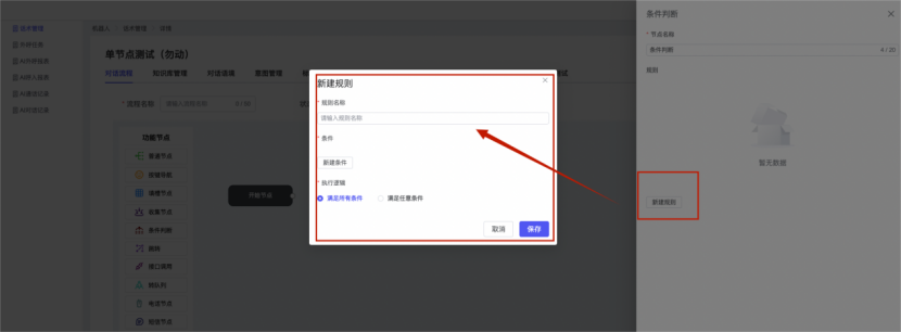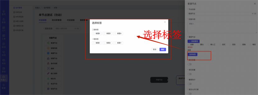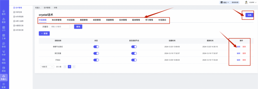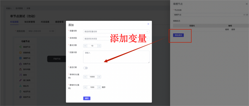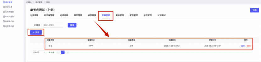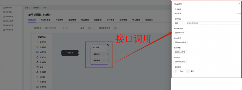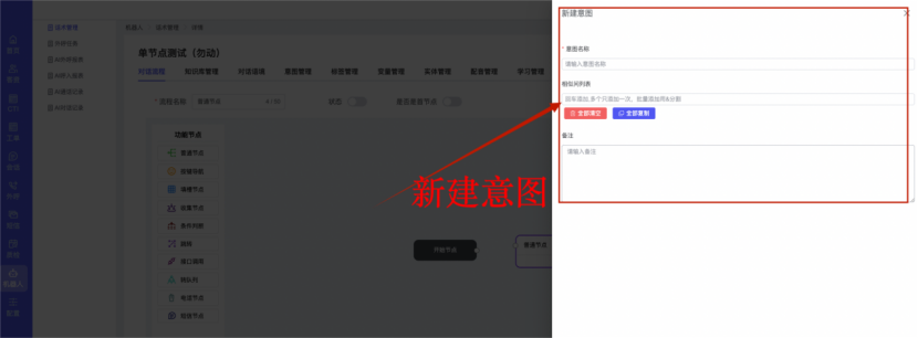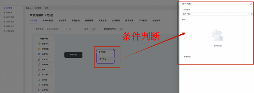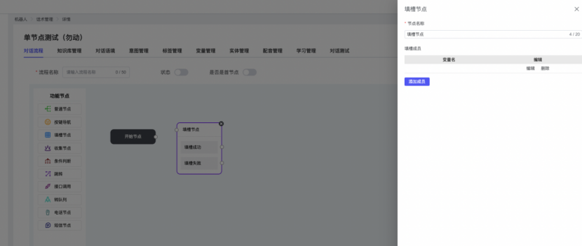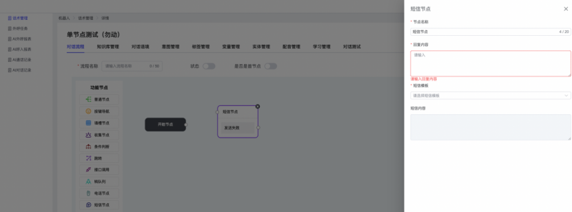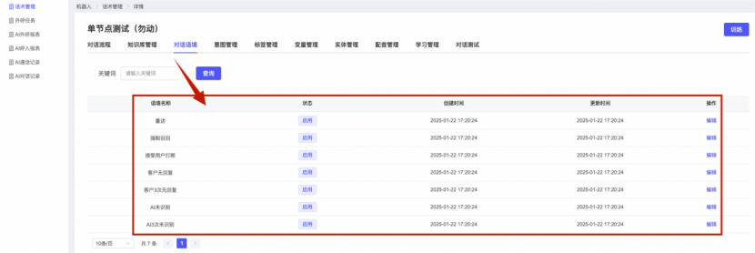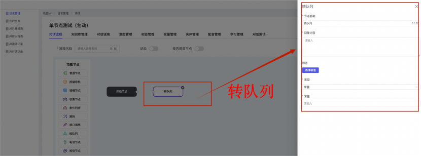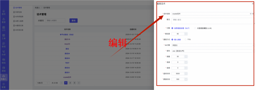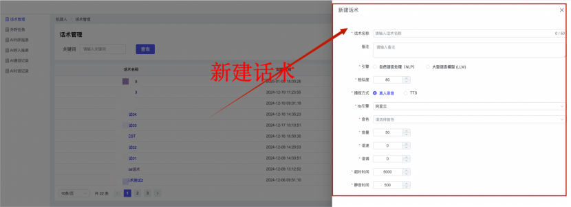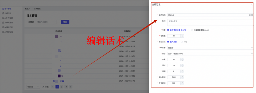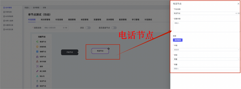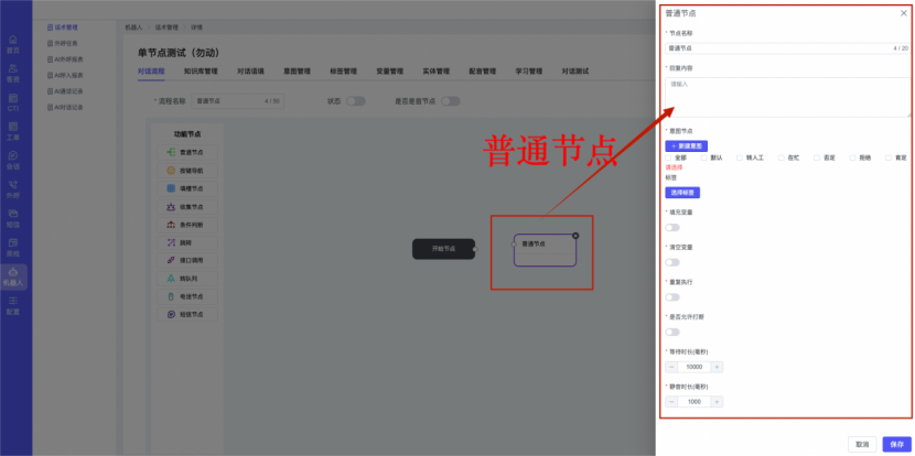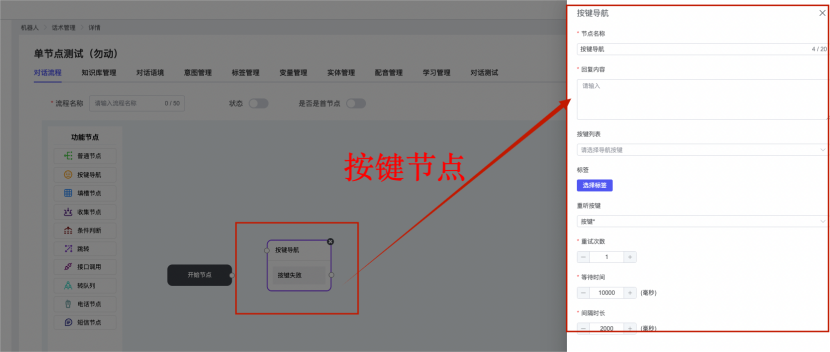 ## 1、话术管理 通过配置话术名称进行配置话术流程,支持新建、编辑  ### 1)查询区 (1)话术名称:通过搜索关键词进行查询,如话术名称 ### 2)列表区 (1)话术名称:通过搜索关键词进行查询,如话术名称 (2)创建时间:创建话术的时间,具体到年月日,时分秒 (3)更新时间:最近一次更新话术的时间,具体到年月日,时分秒 (4)操作:编辑 ### 3)操作 (1)新建,点击“新建”,新建话术的名称,如图  话术名称:输入话术名称,最多输入50个字符 备注:输入备注的内容 引擎:选择是自然语言处理(NLP)还是大型语言模型(LLM) 相似度:输入相似度的阈值 播报方式:选择是真人录音还是TTS合成音 TTS引擎:选择引擎的方式是腾讯云还是讯飞云 音色:下拉选择音色 音量:输入音色的阈值,默认值50 语速:输入语速的阈值 语调:输入语调的阈值 超时时间:机器人放音开始,在规定时间内,视为等待用户说话,默认值5000毫秒. 静音时间:超过此阈值,视为用户停止说话,默认值500毫秒 (2)编辑,点击列表中的“编辑”,编辑话术的名称,如图  ### 4)话术名称 点击话术名称进入配置话术的流程,如图  #### 4.1) 对话流程 搭建话术的主动流程话术,创建话术流程,流程内通过节点拖拽搭建话术,如图  (1)新建:点击“新建”创建话术名称,如图  (2)编辑:点击列表中的编辑,编辑话术名称,如图  ##### 4.1.1)普通节点 使用场景 应用于机器人主动说话,引导用户回复。 例如:机器人说:您好,我这边是XX有限公司,专注客服管理系统这块的,打搅您一分钟做个简短的调研,您看可以吗?,根据用户回答的答法是,肯定、否定、在忙等,再回复不同的话术。 功能介绍 机器人播放节点的话术,根据用户的回答,命中相应的答法,根据答法的分支连线跳转 不同的流程。 功能位置 具体话术 → 对话流程 → “具体流程节点” → 将【普通节点】拖入画布 → 双击节点进入编辑页面,如图  (1) 节点名称:必填,输入节点的名称,默认普通节点 (2) 回复内容:必填,输入机器人回复的内容 (3) 意图节点:选择用户回答的意图,支持选择系统自带的,如全部、默认、转人工、在忙、否定、拒绝、肯定等意图,也支持“新建意图”,如图,输入意图的名称和相似问等  (4) 标签:选择命中的标签,当命中该节点时打上对应的标签,如图  (5) 填充变量:必选,默认关闭,开启和关闭,开启时选择需要填充的变量,场景:如对话过程中需要添加变量或者需要采集到对应的变量时使用,如图  (6) 清空变量:必选,默认关闭,开启和关闭。 场景:在这个话术中引用变量的情况下,对话流程多次经过此节点时,清除之前的变量赋值。(如:机器人:“询问你叫什么名字? ”客户回答“张三”后;机器人第二次询问,“询问你的姓名”,客户回答“李四”后,为避免因语音采集错误导致的变量赋值错误,此时需要先清空变量再赋值。如图  (7) 重复执行:必选,默认关闭,开启和关闭 使用场景:在某些信息收集和身份确认的场景,如果用户回答的不是我们想要的场景,我们需要再问一次,引导用户回答。 功能描述:每当用户答非所问,开启【重复执行】后,机器人会再次播放话术,以便引导用户回答。 考虑到过多次重复对用户体验的影响,【节点重复】最大次数限制为 3 次,到达最大次数后按照全局语境【无法应答处理】或者【默认】分支的逻辑处理。勾选了【默认】分支 则执行默认的跳转逻辑,没有勾选则执行【无法应答处理】的逻辑。如图  (8) 是否允许打断:在此节点,机器人播放话术时,禁止用户打断。 (9) 等待时长(毫秒):必填,默认10000,范围为 1ms~10000ms,超过此阈值,视为用户停止说话 (10) 静音时长(毫秒):必填,默认1000,自机器人放音开始,在设定时间内,默认等待用户说话 ##### 4.1.2)按键导航 使用场景 举例:我们日常打银行客服热线会遇到按键导航,如:按 1 选择信用卡服务,按 2 选择储蓄卡服务,按 0 选择人工服务。 功能介绍 通过按键,跳转不同的流程。 功能位置 具体话术 → 对话流程 → “具体流程节点” → 将【按键导航】拖入画布 → 双击节点进入编辑页面,如图  (1)节点名称:必填,输入节点的名称,默认按键导航 (2)回复内容:输入机器人的回复内容 (3)按键列表:选择按键,支持多选,比如选择按键1,按键2 (4)标签:选择标签,当命中该节点时自动打上标签 (5)重听按键:下拉选择重听的按键 (6)重试次数:按键错误,重新输入的次数 (7)等待时间:必填,默认10000,范围为 1ms~10000ms,超过此阈值,视为用户停止说话 (8)间隔时长:必填,默认1000,自机器人放音开始,在设定时间内,默认等待用户说话 (9)按键失败:如果当按键失败时可以配置失败的流程 ##### 4.1.3)填槽节点接口 使用场景 提供必要条件后,系统才能执行下一步动作的场景。如查需要收集到客户需要购买什么类型的女装,才能给出女装的价格 功能介绍 当用户的需求中缺乏一些必要条件时,由对话系统主动发问,把必要条件全部集齐之后再去做最终的满足执行。 功能位置 具体话术 → 对话流程→ “具体流程节点” → 将【填槽节点】拖入画布 → 双击节点进入编辑页面,如图  (1) 节点名称:必填,输入节点的名称,默认填槽节点 (2) 填槽成员:添加成员,添加需要填槽的信息,如图  (2.1)变量名称:下拉选择要赋值的变量 (2.2)实体类型:下拉选择实体的类型 (2.3)重试次数:填槽失败时,向客户询问的次数 (2.4)回复内容:填槽失败时,向客户询问的话术 (2.5)是否打断:在此节点,机器人播放话