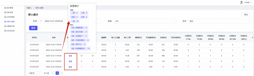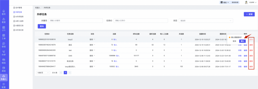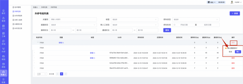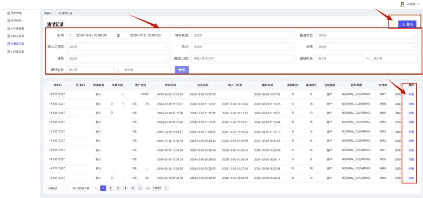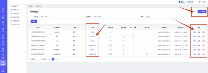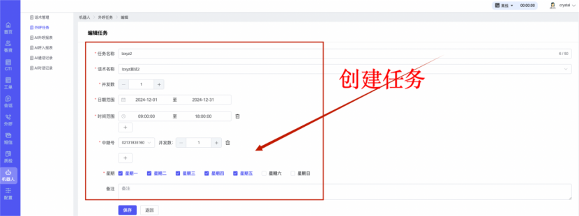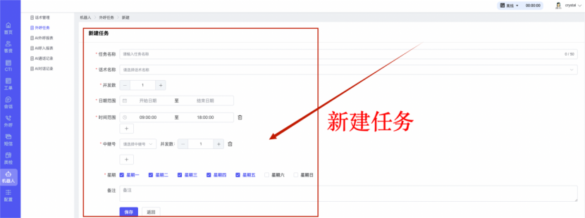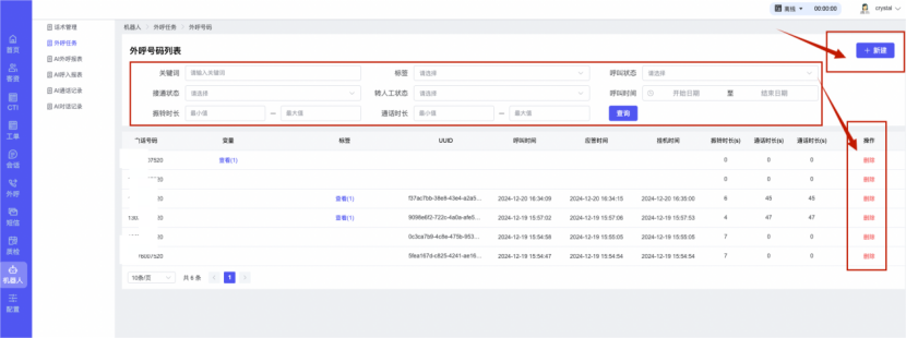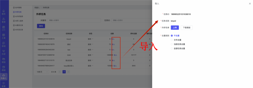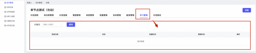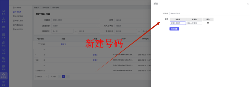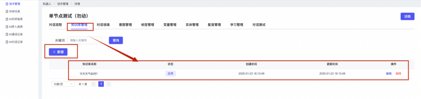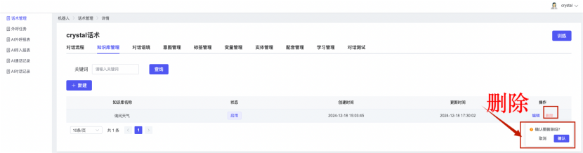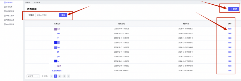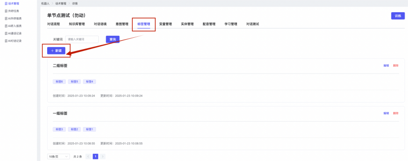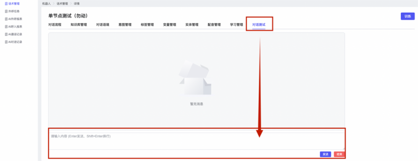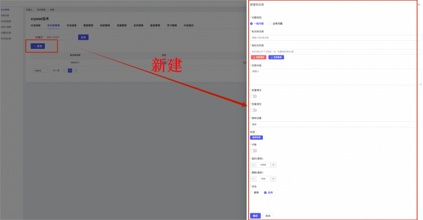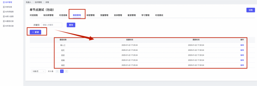 ## 1、话术管理 通过配置话术名称进行配置话术流程,支持新建、编辑  ### 1)查询区 (1)话术名称:通过搜索关键词进行查询,如话术名称 ### 2)列表区 (1)话术名称:通过搜索关键词进行查询,如话术名称 (2)创建时间:创建话术的时间,具体到年月日,时分秒 (3)更新时间:最近一次更新话术的时间,具体到年月日,时分秒 (4)操作:编辑 ### 3)操作 (1)新建,点击“新建”,新建话术的名称,如图  话术名称:输入话术名称,最多输入50个字符 备注:输入备注的内容 引擎:选择是自然语言处理(NLP)还是大型语言模型(LLM) 相似度:输入相似度的阈值 播报方式:选择是真人录音还是TTS合成音 TTS引擎:选择引擎的方式是腾讯云还是讯飞云 音色:下拉选择音色 音量:输入音色的阈值,默认值50 语速:输入语速的阈值 语调:输入语调的阈值 超时时间:机器人放音开始,在规定时间内,视为等待用户说话,默认值5000毫秒. 静音时间:超过此阈值,视为用户停止说话,默认值500毫秒 (2)编辑,点击列表中的“编辑”,编辑话术的名称,如图  ### 4)话术名称 点击话术名称进入配置话术的流程,如图  #### 4.1) 对话流程 搭建话术的主动流程话术,创建话术流程,流程内通过节点拖拽搭建话术,如图  (1)新建:点击“新建”创建话术名称,如图  (2)编辑:点击列表中的编辑,编辑话术名称,如图  ##### 4.1.1)普通节点 使用场景 应用于机器人主动说话,引导用户回复。 例如:机器人说:您好,我这边是XX有限公司,专注客服管理系统这块的,打搅您一分钟做个简短的调研,您看可以吗?,根据用户回答的答法是,肯定、否定、在忙等,再回复不同的话术。 功能介绍 机器人播放节点的话术,根据用户的回答,命中相应的答法,根据答法的分支连线跳转 不同的流程。 功能位置 具体话术 → 对话流程 → “具体流程节点” → 将【普通节点】拖入画布 → 双击节点进入编辑页面,如图  (1) 节点名称:必填,输入节点的名称,默认普通节点 (2) 回复内容:必填,输入机器人回复的内容 (3) 意图节点:选择用户回答的意图,支持选择系统自带的,如全部、默认、转人工、在忙、否定、拒绝、肯定等意图,也支持“新建意图”,如图,输入意图的名称和相似问等  (4) 标签:选择命中的标签,当命中该节点时打上对应的标签,如图  (5) 填充变量:必选,默认关闭,开启和关闭,开启时选择需要填充的变量,场景:如对话过程中需要添加变量或者需要采集到对应的变量时使用,如图  (6) 清空变量:必选,默认关闭,开启和关闭。 场景:在这个话术中引用变量的情况下,对话流程多次经过此节点时,清除之前的变量赋值。(如:机器人:“询问你叫什么名字? ”客户回答“张三”后;机器人第二次询问,“询问你的姓名”,客户回答“李四”后,为避免因语音采集错误导致的变量赋值错误,此时需要先清空变量再赋值。如图  (7) 重复执行:必选,默认关闭,开启和关闭 使用场景:在某些信息收集和身份确认的场景,如果用户回答的不是我们想要的场景,我们需要再问一次,引导用户回答。 功能描述:每当用户答非所问,开启【重复执行】后,机器人会再次播放话术,以便引导用户回答。 考虑到过多次重复对用户体验的影响,【节点重复】最大次数限制为 3 次,到达最大次数后按照全局语境【无法应答处理】或者【默认】分支的逻辑处理。勾选了【默认】分支 则执行默认的跳转逻辑,没有勾选则执行【无法应答处理】的逻辑。如图  (8) 是否允许打断:在此节点,机器人播放话术时,禁止用户打断。 (9) 等待时长(毫秒):必填,默认10000,范围为 1ms~10000ms,超过此阈值,视为用户停止说话 (10) 静音时长(毫秒):必填,默认1000,自机器人放音开始,在设定时间内,默认等待用户说话 ##### 4.1.2)按键导航 使用场景 举例:我们日常打银行客服热线会遇到按键导航,如:按 1 选择信用卡服务,按 2 选择储蓄卡服务,按 0 选择人工服务。 功能介绍 通过按键,跳转不同的流程。 功能位置 具体话术 → 对话流程 → “具体流程节点” → 将【按键导航】拖入画布 → 双击节点进入编辑页面,如图  (1)节点名称:必填,输入节点的名称,默认按键导航 (2)回复内容:输入机器人的回复内容 (3)按键列表:选择按键,支持多选,比如选择按键1,按键2 (4)标签:选择标签,当命中该节点时自动打上标签 (5)重听按键:下拉选择重听的按键 (6)重试次数:按键错误,重新输入的次数 (7)等待时间:必填,默认10000,范围为 1ms~10000ms,超过此阈值,视为用户停止说话 (8)间隔时长:必填,默认1000,自机器人放音开始,在设定时间内,默认等待用户说话 (9)按键失败:如果当按键失败时可以配置失败的流程 ##### 4.1.3)填槽节点接口 使用场景 提供必要条件后,系统才能执行下一步动作的场景。如查需要收集到客户需要购买什么类型的女装,才能给出女装的价格 功能介绍 当用户的需求中缺乏一些必要条件时,由对话系统主动发问,把必要条件全部集齐之后再去做最终的满足执行。 功能位置 具体话术 → 对话流程→ “具体流程节点” → 将【填槽节点】拖入画布 → 双击节点进入编辑页面,如图  (1) 节点名称:必填,输入节点的名称,默认填槽节点 (2) 填槽成员:添加成员,添加需要填槽的信息,如图  (2.1)变量名称:下拉选择要赋值的变量 (2.2)实体类型:下拉选择实体的类型 (2.3)重试次数:填槽失败时,向客户询问的次数 (2.4)回复内容:填槽失败时,向客户询问的话术 (2.5)是否打断:在此节点,机器人播放话