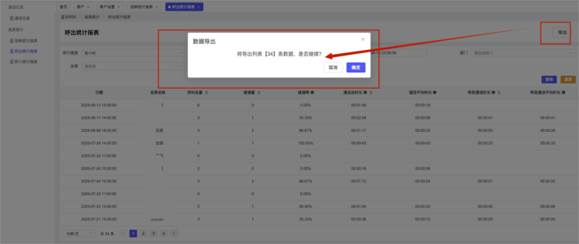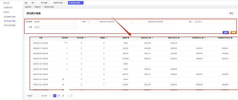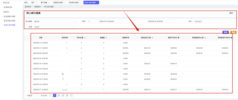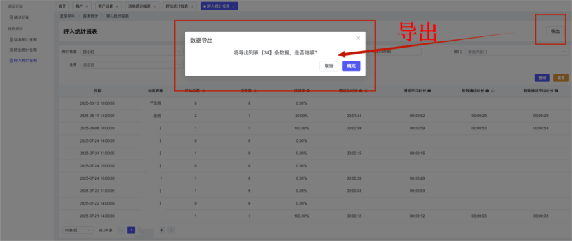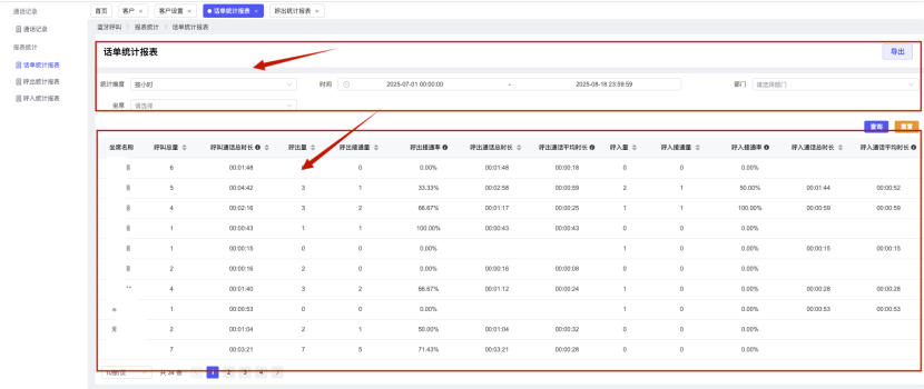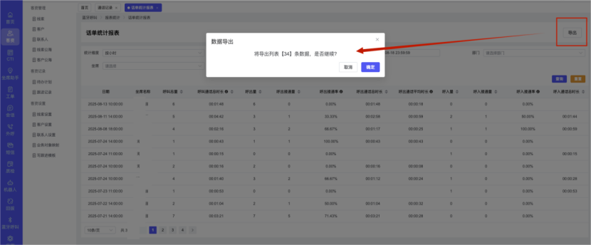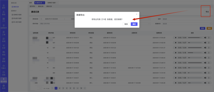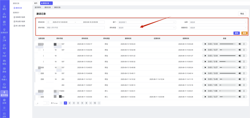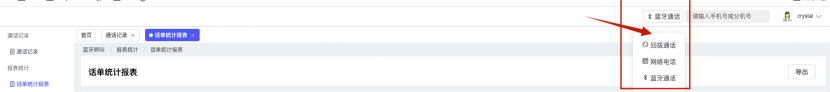 背景:需要进行蓝牙电话呼叫时使用,需要装插件进行连接,联系相关人员另见安装包,切换工具条蓝牙通话进行外呼电话  ## 1、通话记录 记录蓝牙电话的通话记录,如图  ### 1、通话记录 #### 1)查询区 (1)呼叫时间:通过搜索蓝牙电话呼叫的开始时间到结束时间段进行搜索 (2)部门:下拉选择查询的部门 (3)坐席:下拉选择 (4)呼叫号码:输入呼叫的电话号码进行查询 (5)呼叫类型:下拉选择呼叫的类型,是呼入还是呼出 (6)接通状态:下拉选择电话接通的状态,是未接通还是已接通的状态 #### 2)列表区 (1)坐席名称:显示坐席的昵称 (2)呼叫号码:显示外呼的电话号码 (3)呼叫时间:显示呼叫的时间,具体到年月日,时分秒 (4)呼叫类型:显示呼叫的类型,是呼入还是呼出 (5)振铃时间:显示振铃的时间,具体到年月日,时分秒 (6)应答时间:显示应答的时间,具体到年月日,时分秒 (7)结束时间:显示通话结束的时间,具体到年月日,时分秒 (8)录音:显示蓝牙电话的录音,支持在线播放、设置倍速播放、下载等 #### 3)导出 点击“导出”,导出列表的数据,点击如图  ## 2、报表统计 ### 1、话单统计报表 统计蓝牙电话话单的报表情况,如图  #### 1)查询区 (1)统计维度:选择是按小时统计,还是按月、按天 (2)时间:按通话的开始时间到结束时间来检索数据 (3)部门:下拉选择要查询的部门 (4)坐席:下拉选择查询的坐席 #### 2) 列表区 (1)日期:话单产生的时间,如果是按小时则显示到具体的年月日时分秒;如果是天,则显示到具体的年月日,如果是月报表,则显示年月 (2)坐席名称:显示坐席的昵称 (3)呼叫总量:显示呼叫的电话总量 (4)呼叫通话时长:话单结束的时间—话单开始的时间 (5)呼出量:外呼的数量 (6)呼出接通量:外呼接通量 (7)呼出接通率: 呼出接通量/呼出量 (8)呼出通话总时长:呼出电话的总通话时长 (9)呼出通话平均时长:呼出通话总时长/呼出接通量 (10)呼入量:蓝牙电话呼入的总量 (11)呼入接通量:蓝牙电话呼入接听的数量 (12)呼入接通率:呼入接通量/呼入量 (13)呼入通话总时长:蓝牙电话呼入的总通话时长 (14)呼入通话平均时长:呼入通话总时长/呼入接通量 #### 3)导出 点击导出,导出列表的数据,如图  ### 2、呼出统计报表 统计呼出的话单,如图  #### 1)查询区 (1)统计维度:选择是按小时统计,还是按月、按天 (2)时间:按通话的开始时间到结束时间来检索数据 (3)部门:下拉选择要查询的部门 (4)坐席:下拉选择查询的坐席 #### 2) 列表区 (1)日期:话单产生的时间,如果是按小时则显示到具体的年月日时分秒;如果是天,则显示到具体的年月日,如果是月报表,则显示年月 (2)坐席名称:显示坐席的昵称 (3)呼叫总量:显示呼叫的电话总量 (4)接通量:显示接通的电话总量 (5)接通率: 接通量/呼叫总量 (6)通话总时长:电话的总通话时长 (7)通话平均时长:通话总时长/接通量 (8)有效通话时长:有效通话的电话总时长 (9)有效通话平均时长:有效通话时长/接通量 #### 3)导出 点击导出,导出列表的数据,如图  ### 3、呼入统计报表 从呼入电话的维度进行统计分析,如图  #### 1)查询区 (1)统计维度:选择是按小时统计,还是按月、按天 (2)时间:按通话的开始时间到结束时间来检索数据 (3)部门:下拉选择要查询的部门 (4)坐席:下拉选择查询的坐席 #### 2) 列表区 (1)日期:话单产生的时间,如果是按小时则显示到具体的年月日时分秒;如果是天,则显示到具体的年月日,如果是月报表,则显示年月 (2)坐席名称:显示坐席的昵称 (3)呼叫总量:显示呼入的电话总量 (4)接通量:显示呼入接通的电话总量 (5)接通率: 接通量/呼叫总量 (6)通话总时长:呼入电话的总通话时长 (7)通话平均时长:通话总时长/接通量 (8)有效通话时长:呼入有效通话的电话总时长 (9)有效通话平均时长:有效通话时长/接通量 #### 3)导出 点击导出,导出列表的数据,如图